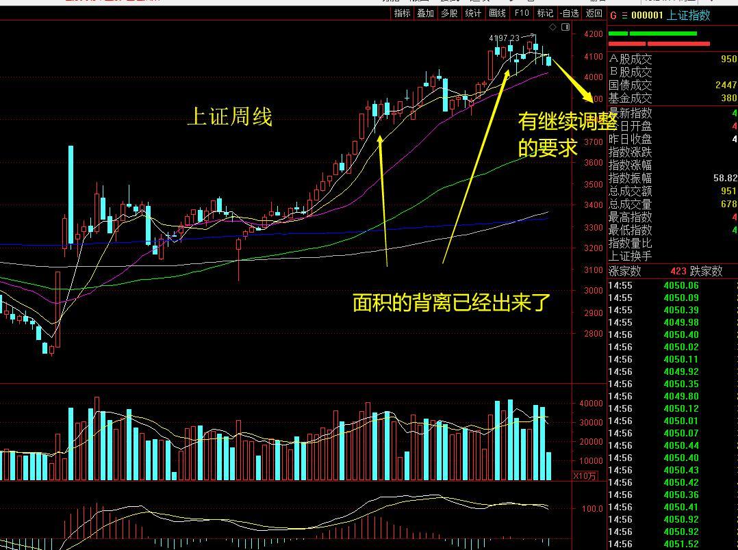 看周线,本周5、10周线死叉,高位面积背离形成了,周线有继续调整的要求,
