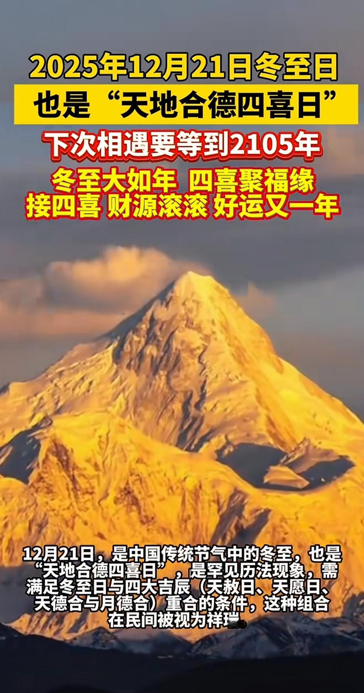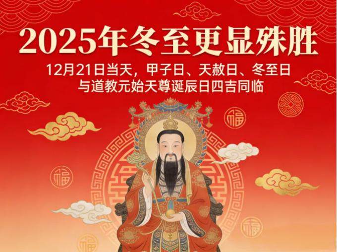 冬至後,白晝漸長、陽氣始生。所謂 「陰極之至,陽氣始生;日南至,日短之至,日影長之至」 的轉折節點,也將其當作 「否極泰來」 的開端,冬至祈福活動便由此而生。民間祈福多圍繞 「安康順遂」,藏在煙火日常里,比如吃熱氣騰騰的餃子或羊肉湯。古代皇家重「祭天」,民間則 「祀祖」。《周禮・春官・神仕》載 「以冬日至,致天神人鬼」。今年冬至又逢 甲子啟元、天赦納福、元始誕辰,四吉疊加。甲子日 作為幹支歷法的起始之日,象征萬象更新(比陽歷元旦更能代表 「一元復始」)。冬月甲子最為良,百事達之多吉助。道教天赦,免眾生罪過。今日是為「天地合德」的大吉日。
