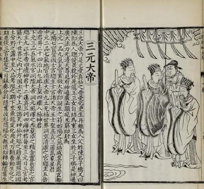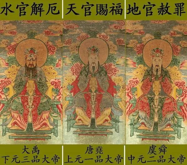 【三官大帝】有說法指遠古三位明君 堯舜禹,分別為天、地、水三官,即「三元」,正月十五,上元天官賜福;七月十五,中元地官赦罪;十月十五,下元水官解厄。宋·吳自牧在《夢粱錄》載:「(十月)十五日,水官解厄之日,宮觀士庶,設齋建醮,或解厄,或薦亡。」「官」的意思,是指「時空流動過程中的節段」。《中華風俗誌》雲:「十月望為下元節,俗傳水宮解厄之辰」。