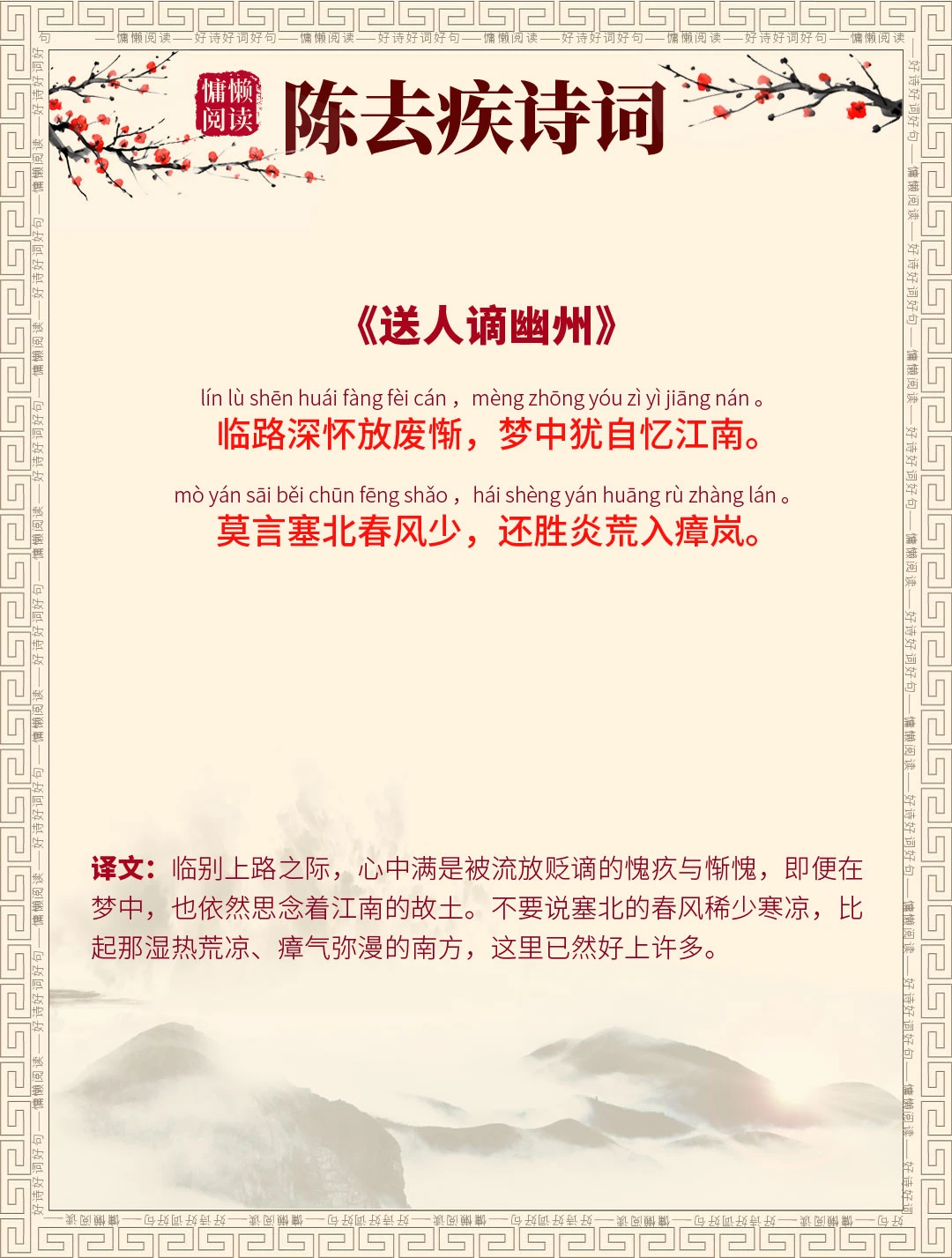 陈去疾,字文医,唐代福州侯官人,元和十四年举进士及第,曾官至邕管副使,工诗能文,才情横溢。《全唐诗》中仅存其诗13首,虽数量不多,却首首精致,或咏景抒情,或咏史言志,或送别怀人,藏着唐代文人的风骨与柔情。