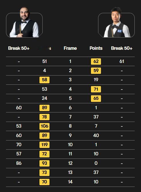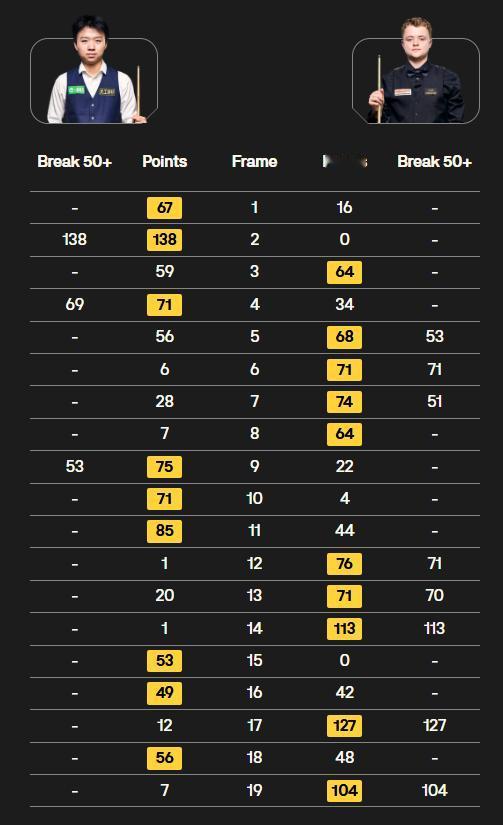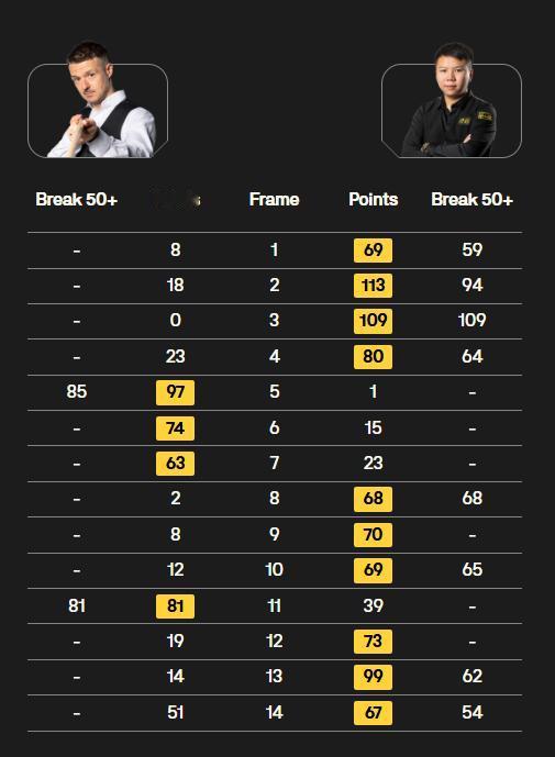 比赛过程相当胶着,你来我往,双方看起来势均力敌。庞俊旭6-7落后的时候连赢三局,实现反超且率先手握赛点,关键时刻的准度还是非常可观,虽说丢掉一局,但此后迅速调整,以10-8结束战斗,其中三杆破百,以及还有五杆50+。