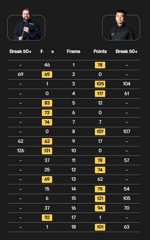两人展开激烈角逐,整体呈现交替领先,彼此都有不错地调整,江俊尝试各种策略,尽量放缓节奏,确实起到不错效果,可惜最后棋差一招,和胜利失之交臂。穆迪准度更高,最后一局单杆破百结束战斗,惊险晋级。