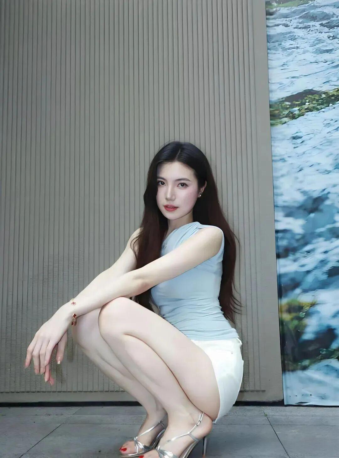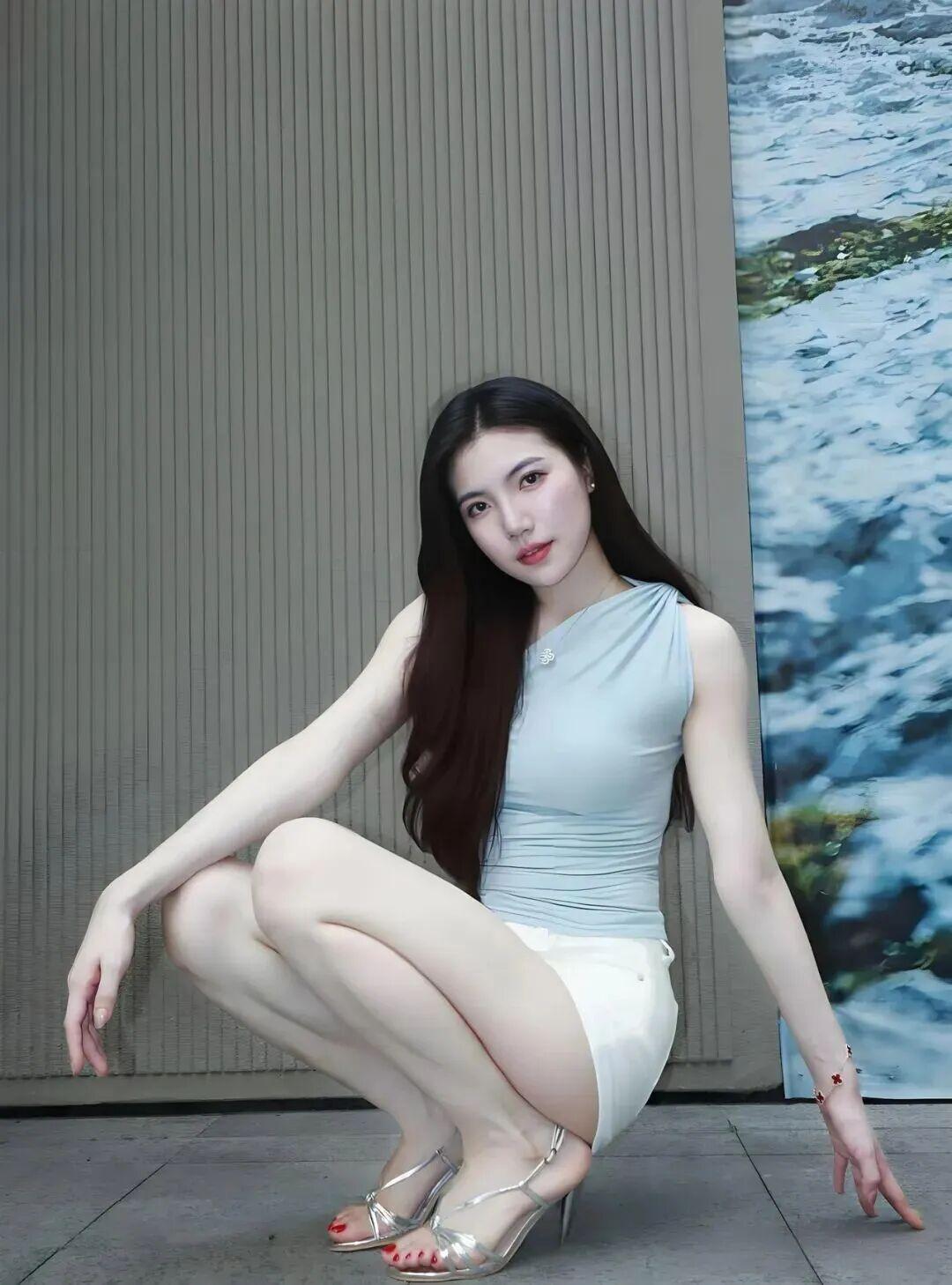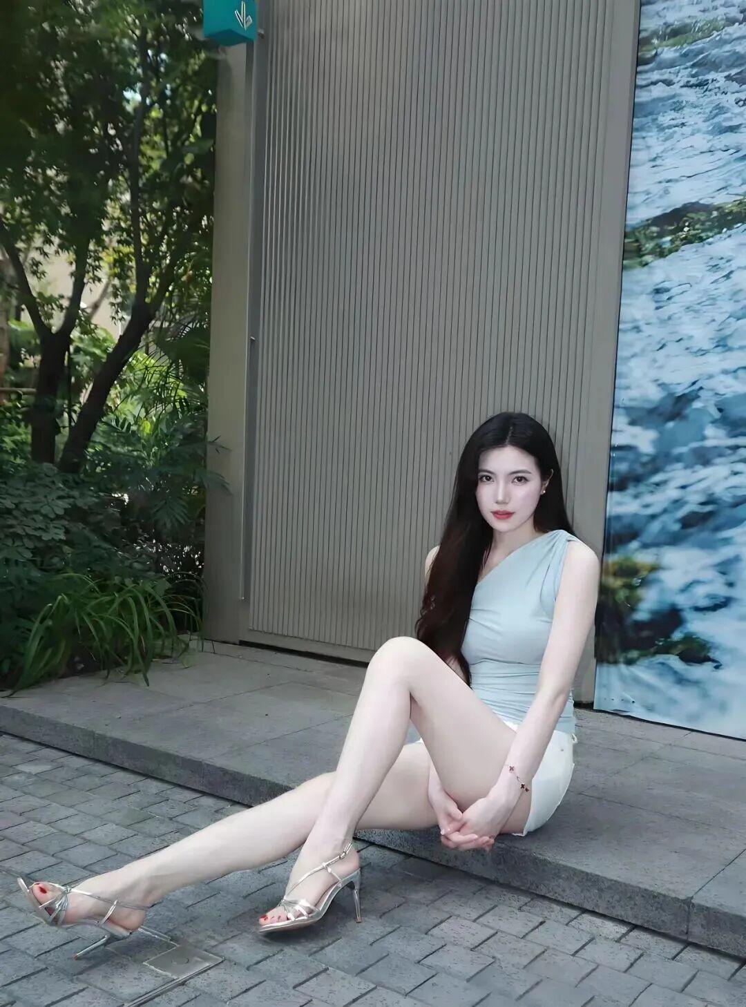 身上穿着浅蓝斜肩修身无袖上衣,简约又能勾勒柔和身形,搭配利落干净的白色紧身短裙,清冷又温柔;脚上踩着银色细带高跟凉鞋,衬得双腿纤细修长,线条精致优越。