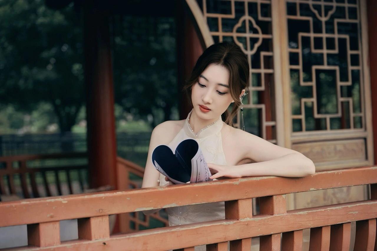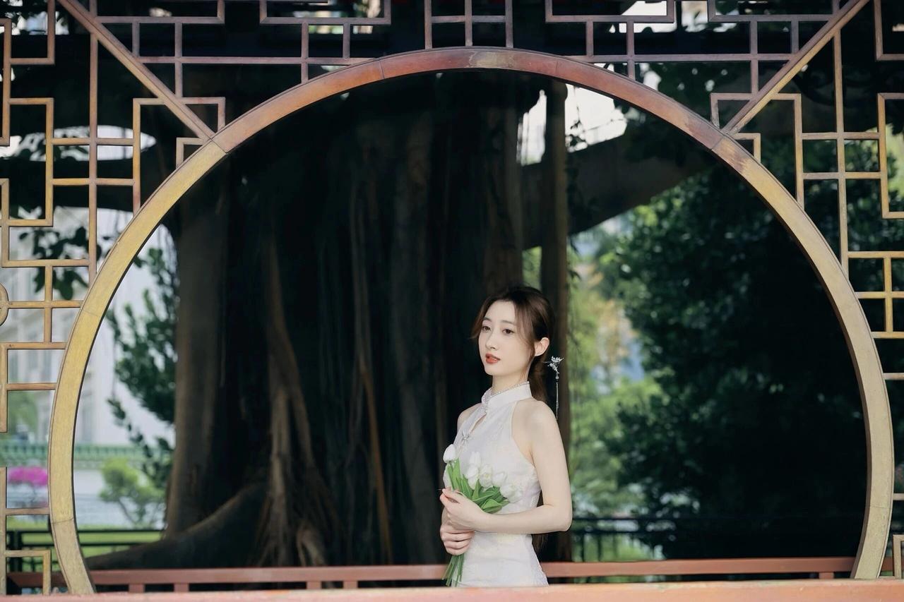 手持古风书卷、白郁金香花束作为道具,取景在亭台廊檐、石桥湖水、园林山石之间,绿瓦窗棂、中式月门尽显古韵。一姿一态都温婉雅致,书卷气韵拉满,人像温柔干净,国风意境十足。