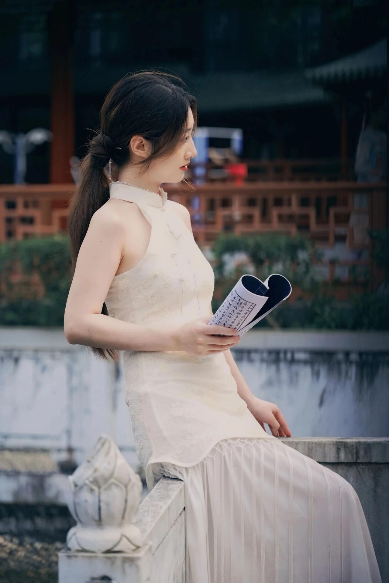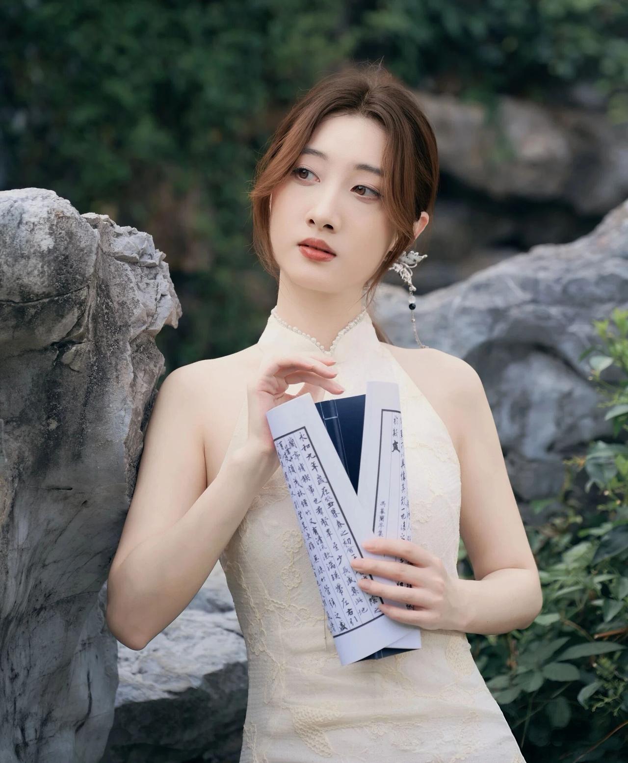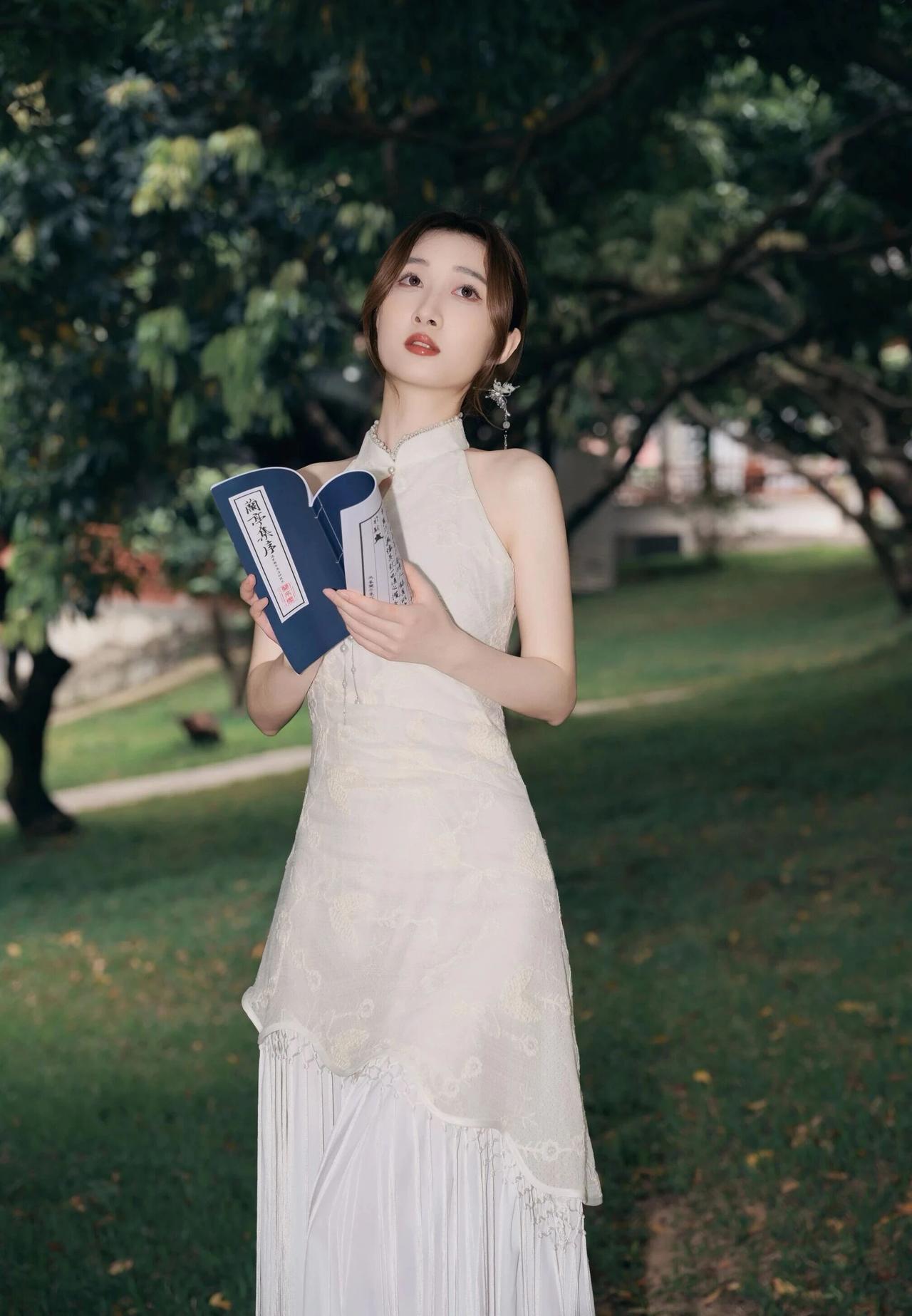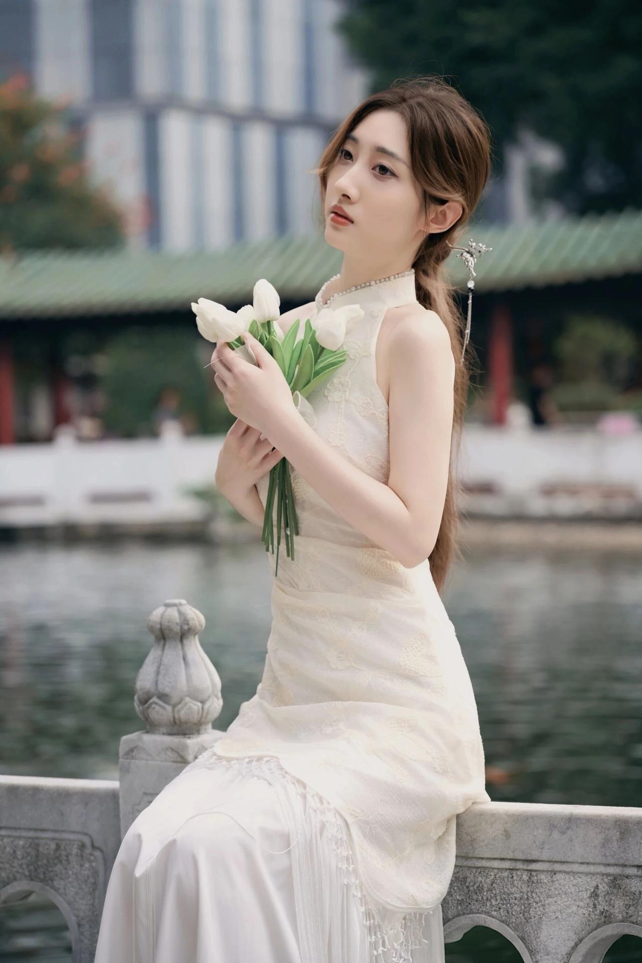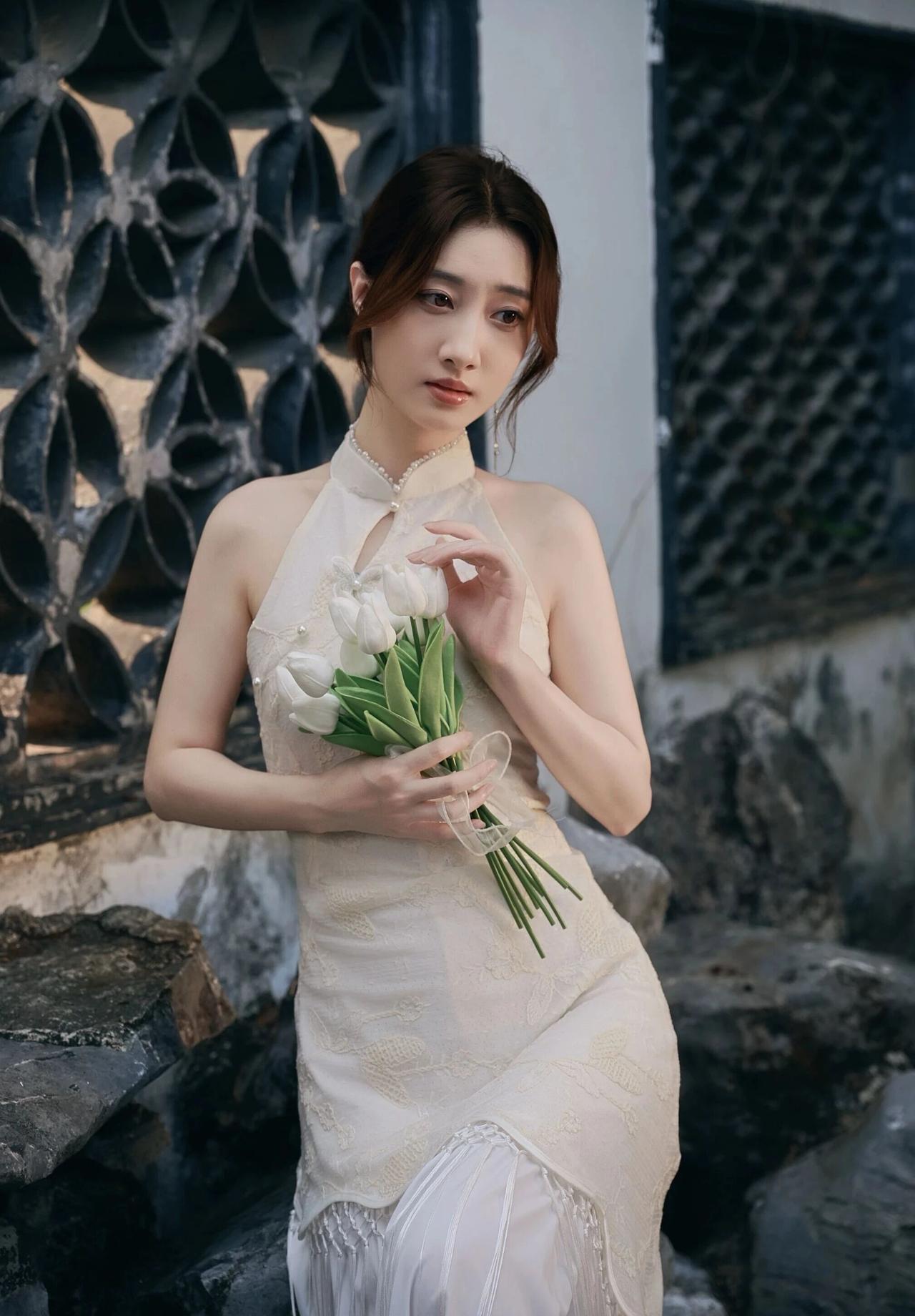身上一袭米白挂脖改良旗袍,立领珍珠包边细节精致,上身蕾丝刺绣细腻温柔,下身拼接网纱流苏裙摆,仙气灵动;挂脖版型完美展露肩颈线条,修身剪裁勾勒温婉身姿,简约纯白调性高级又干净。