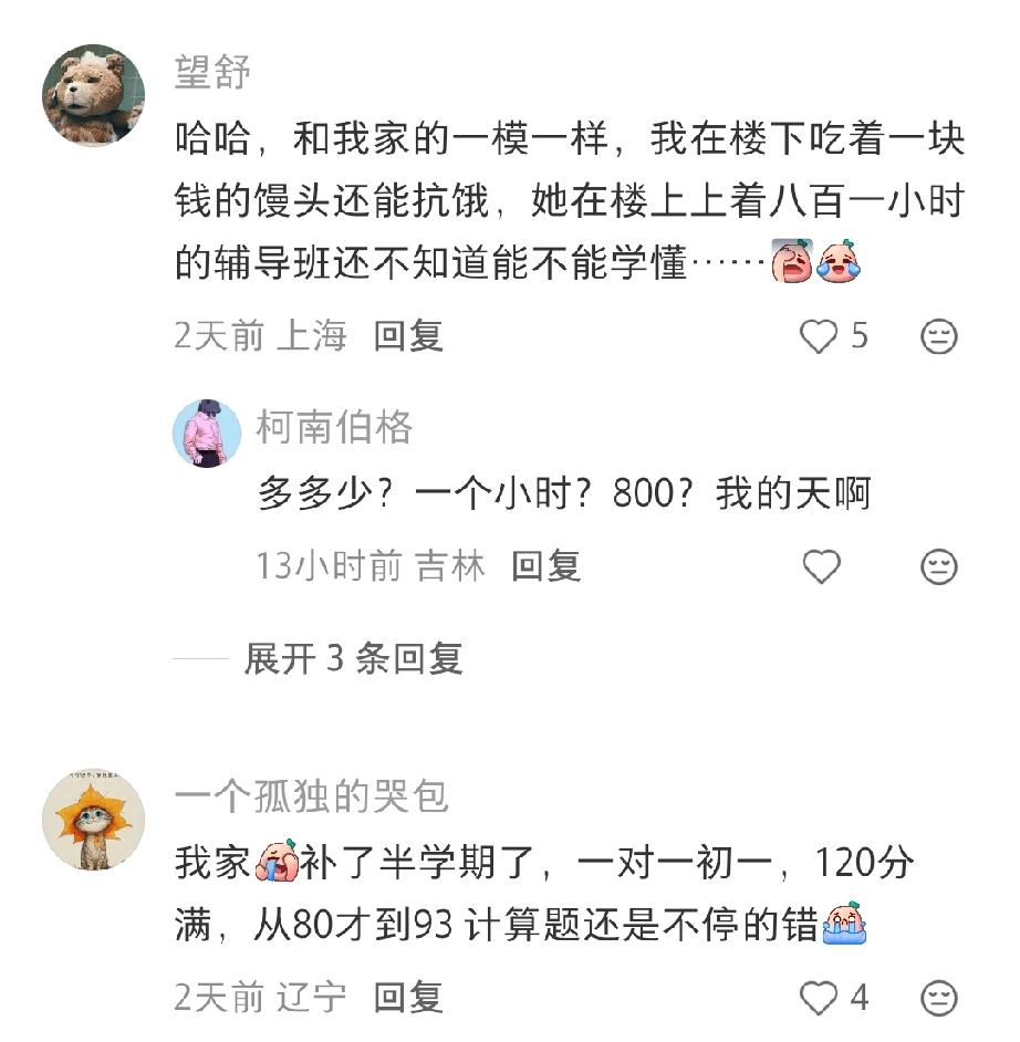 很多家长纷纷说,自己吃一块钱的馒头,却花800一课时给孩子补课。两个小时1000,结果考了67分。挣的钱全给辅导班老师了。补了三年了,还不及格。