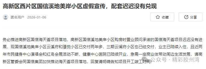 2026年4月,青岛高新区西片区国信溪地美岸小区业主投诉项目涉嫌虚假宣传,购房时置业顾问承诺的国信海天荟商业体配套迟迟未落地,引发业主不满。该小区云溪府、璟悦组团已交付两年多,三期云澜府也已交付,业主陆续入住,但核心商业配套海天荟毫无进展。