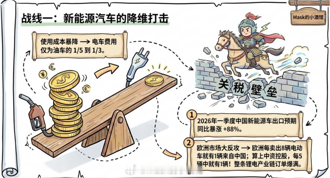 最先感受到甜头的,就是新能源汽车。油价越高,电动车的使用成本优势就越明显。同样跑一公里,油车现在烧油烧得心疼,电车只用原来1/5到1/3的费用。欧洲好几个国家紧急放宽对中国电动车的准入,原本的关税壁垒也悄悄松动。结果2026年一季度,中国新能源车出口同比暴涨88%。欧洲每卖出的8辆电动车里,就有1辆来自中国,如果算上中资控股,那就是每5辆里面就有一辆。从电池到四大材料,整条锂电产业链订单都爆满了。很多动力电池企业海外营收占比已经超过40%,订单排到了下半年还接不完。