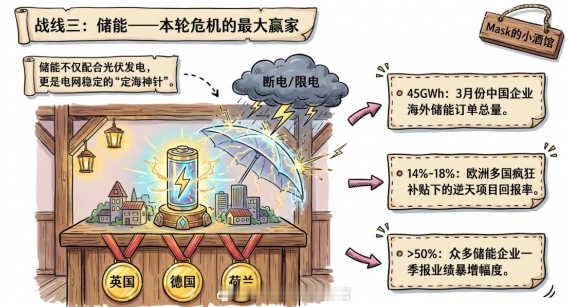 而储能,才是这波里最大的赢家。欧洲户用储能和大储能需求像火山一样爆发。中国企业3月份海外储能订单已经超过45GWh。英国、德国、荷兰疯狂补贴储能项目,项目回报率干到14%-18%。很多储能企业一季报增长超过50%。为什么储能最赚?因为它不光能配合光伏发电,还能独立解决电网稳定问题。油价高位震荡的时候,大家最怕断电、限电,有了储能,心里就踏实多了。