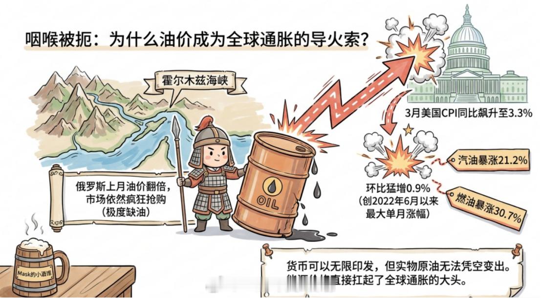 新能源行业和石油化工躺赢了。美国和伊朗冲突了这么久,现在全球只有两个行业赚钱了,一个是石油化工行业,一个是新能源行业。石油化工是因为可以涨价,所以赚钱,新能源是因为能替代石油,所以赚钱。很多人不知道,俄罗斯上个月油价直接翻了一倍,但还是有很多人买,为什么?因为大家实在缺油啊!油价一冲高,美国的通胀数据马上就炸了。3月CPI同比涨到3.3%,环比猛增0.9%,创下2022年6月以来的最大单月涨幅。其中汽油涨了21.2%,燃油涨了30.7%,能源这一项几乎扛起了整个通胀的大头。