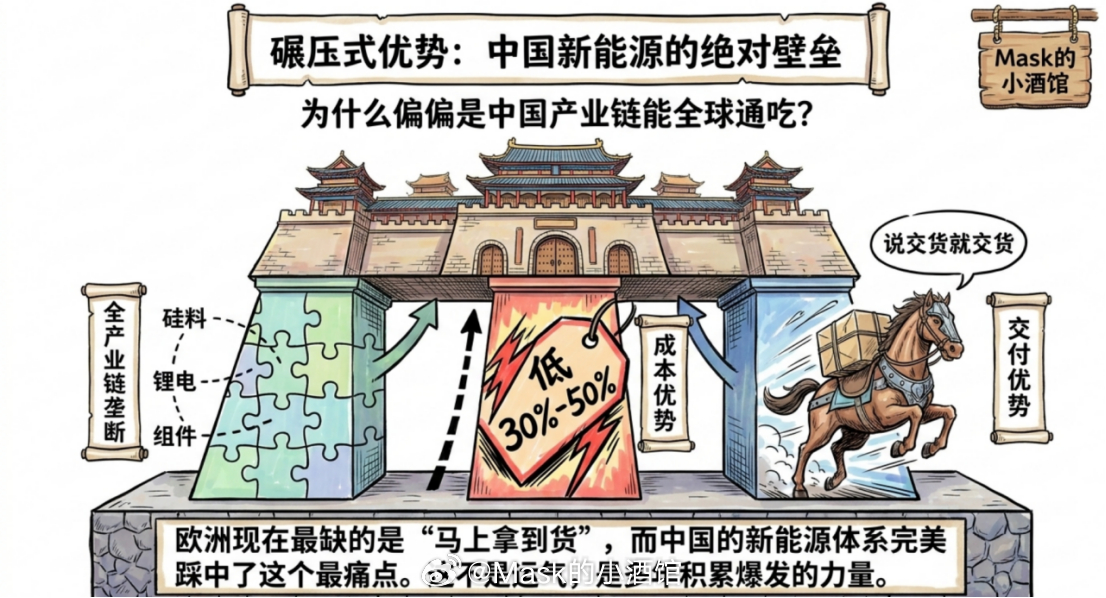 看到这里,你可能会问:为什么偏偏是中国新能源产业链能全球通吃?答案就三个字:碾压式优势。我们有全产业链垄断,从硅料、硅片、组件,到锂电材料、电芯、系统集成,再到风电配套,全球大部分产能都在中国。我们有成本优势,比国外低30%-50%。我们还有交付优势,供应链稳定,说交货就交货。欧洲现在最缺的就是“能马上拿到货”。而中国新能源,正好踩中他们最痛的点。