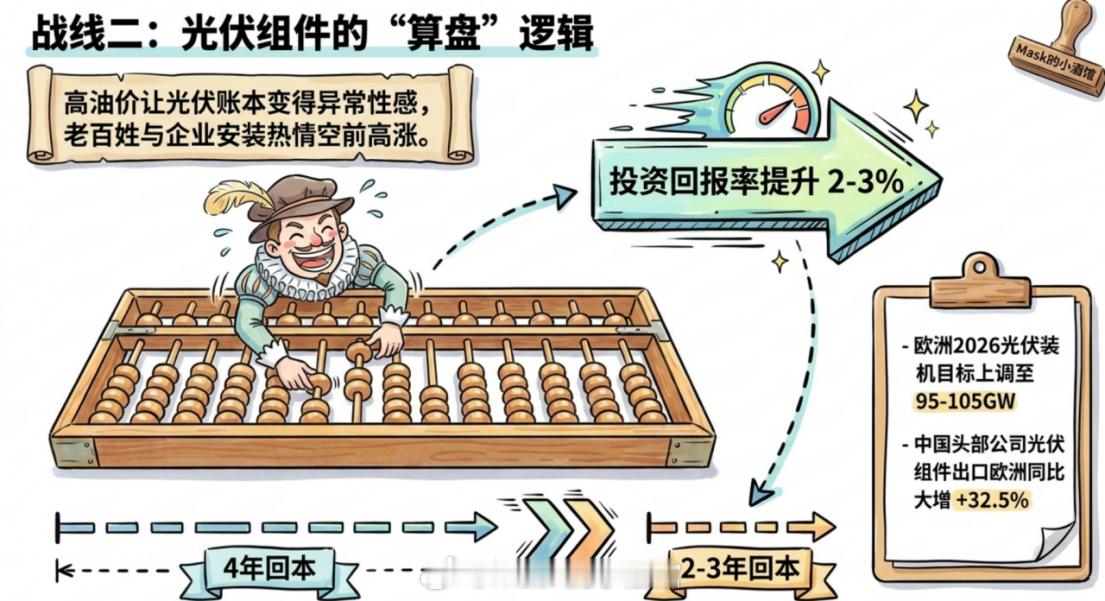 接下来,受益更大的是光伏和储能。霍尔木兹海峡一封锁,欧洲立刻醒悟:把能源命脉捏在别人手里,太危险了!光伏加上储能,才是真正的“能源独立”。光伏组件出口欧洲同比大增32.5%,多家中国头部公司几乎包揽了欧洲主流市场。欧洲直接把2026年光伏装机目标从80GW上调到95-105GW,户用、工商业、大型电站一起冲。高油价下,光伏的投资回报率直接提升2-3个百分点。原本4年回本的项目,现在2-3年就能回本。老百姓和企业一看账本,安装光伏的热情空前高涨。