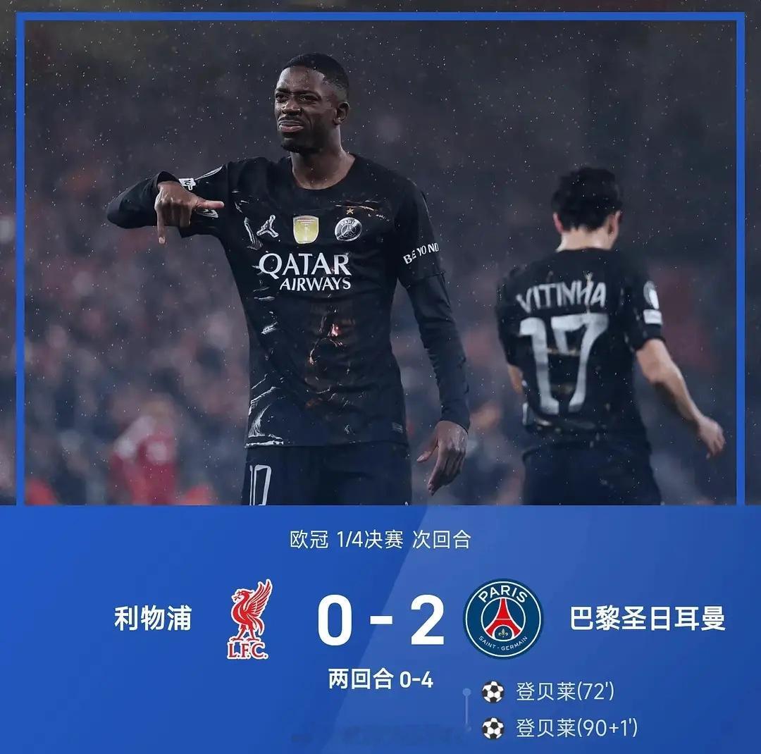 4月15日 25/26赛季欧冠1/4决赛次回合,巴黎圣日耳曼主场以2-0轻取利物浦,以总比分4-0(首回合2-0)淘汰对手,顺利晋级到四强的行列。下半时比赛里,登贝莱上演梅开二度的好戏,帮助大巴黎取得胜利。接下来的半决赛,大巴黎将面对皇马和拜仁之间的胜者。