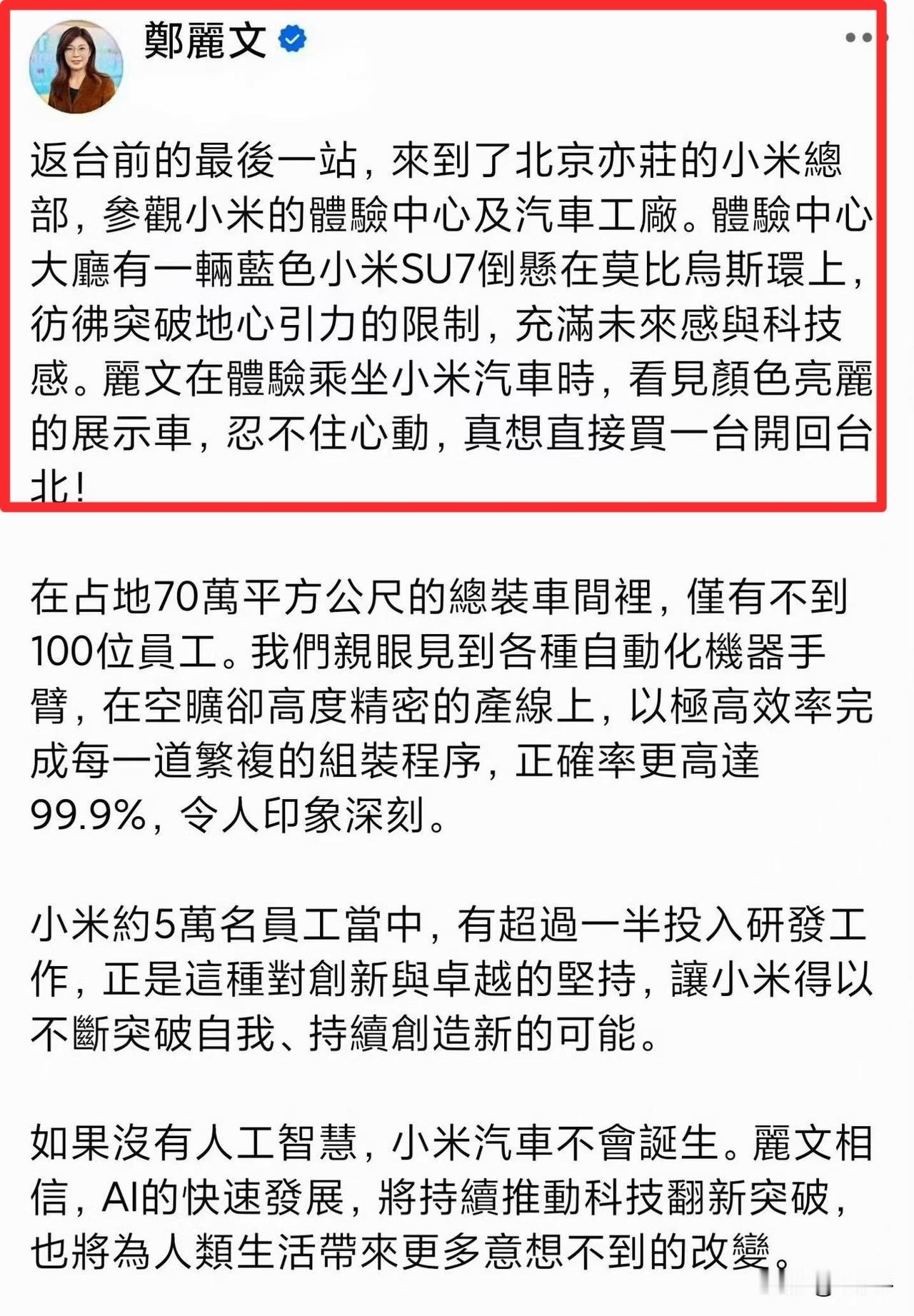在参访小米汽车超级工厂时,郑丽文说,“她们家好多东西都是小米的。”