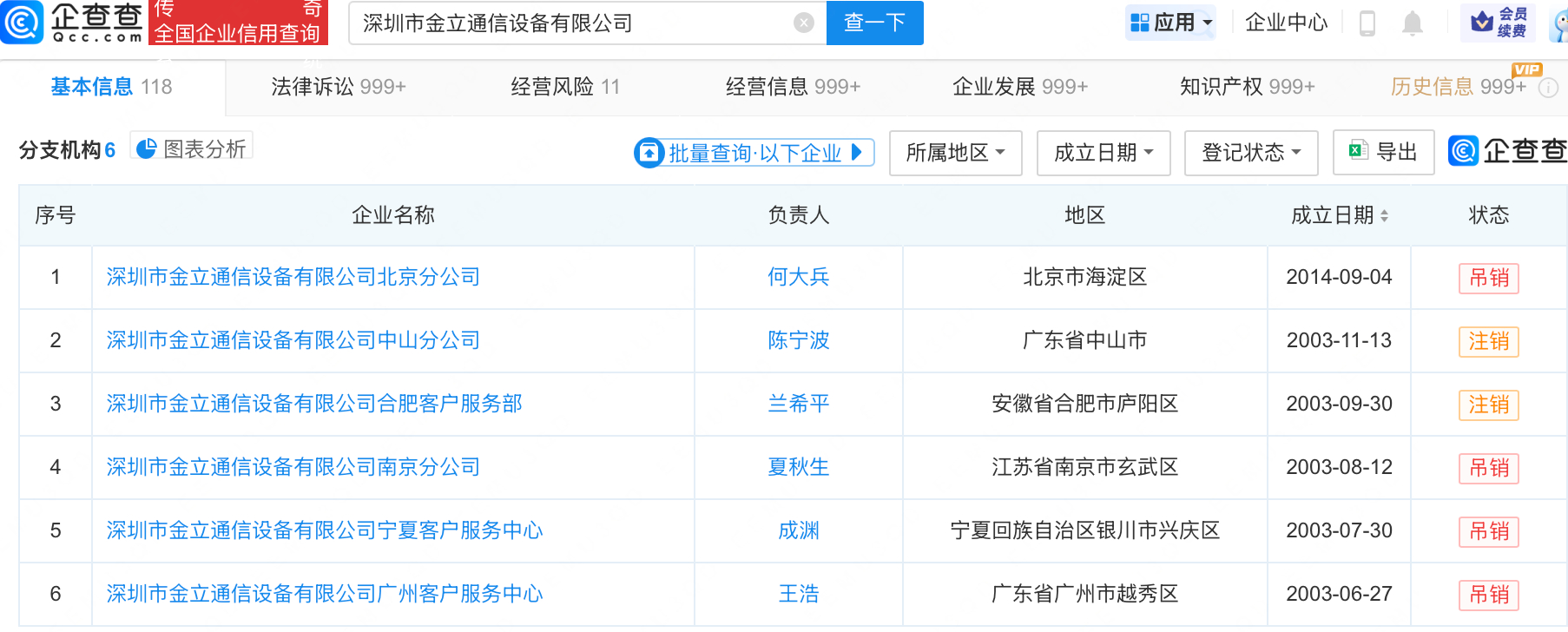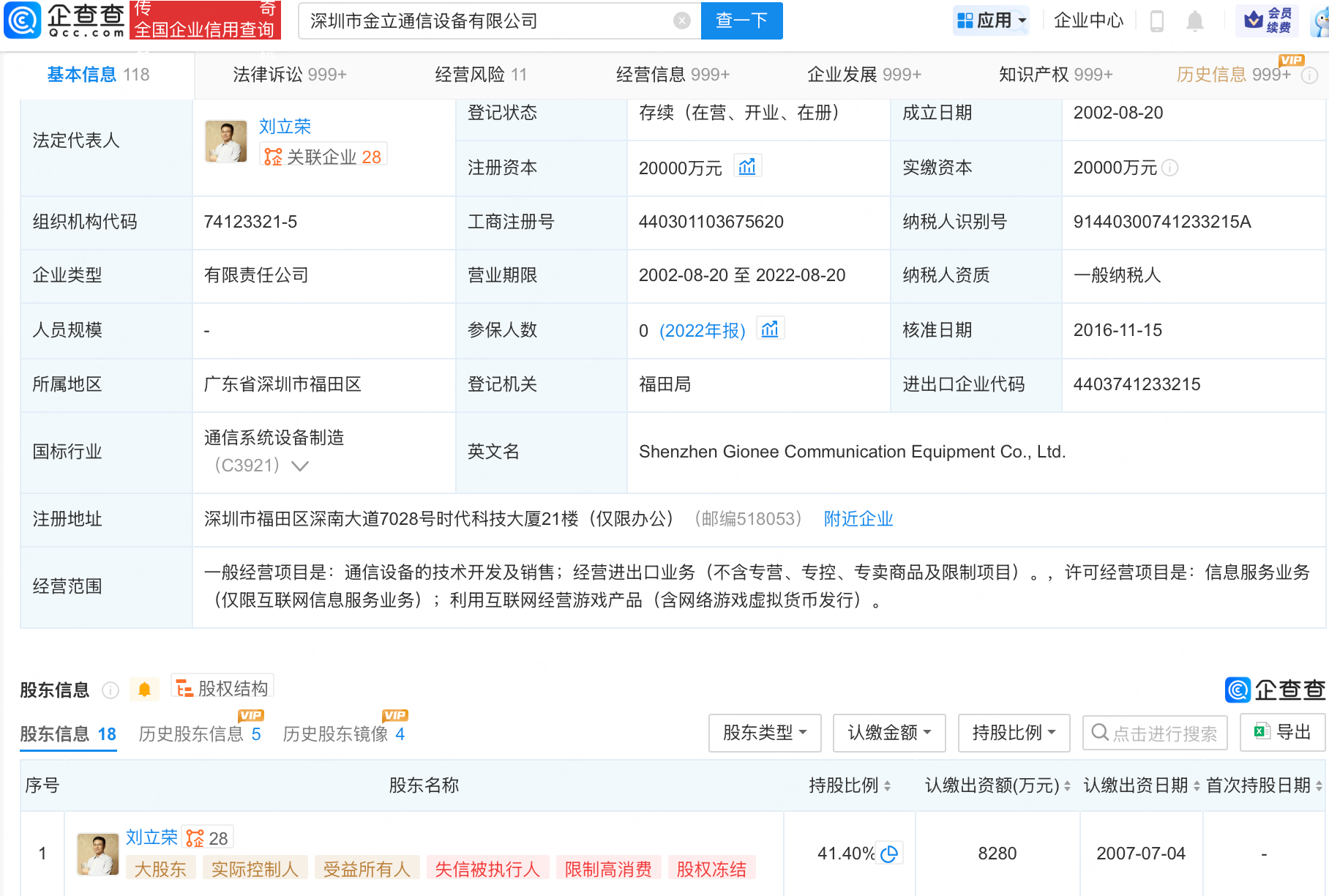 观察者网查询企查查APP显示,金立关联公司深圳市金立通信设备有限公司成立于2002年,法定代表人及大股东为刘立荣。该公司共有6家分支机构,目前均已吊销或注销。