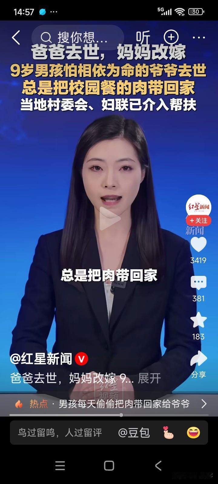 男孩每天中午在学校就餐时,总会偷偷把肉藏起来,带回家给爷爷吃。