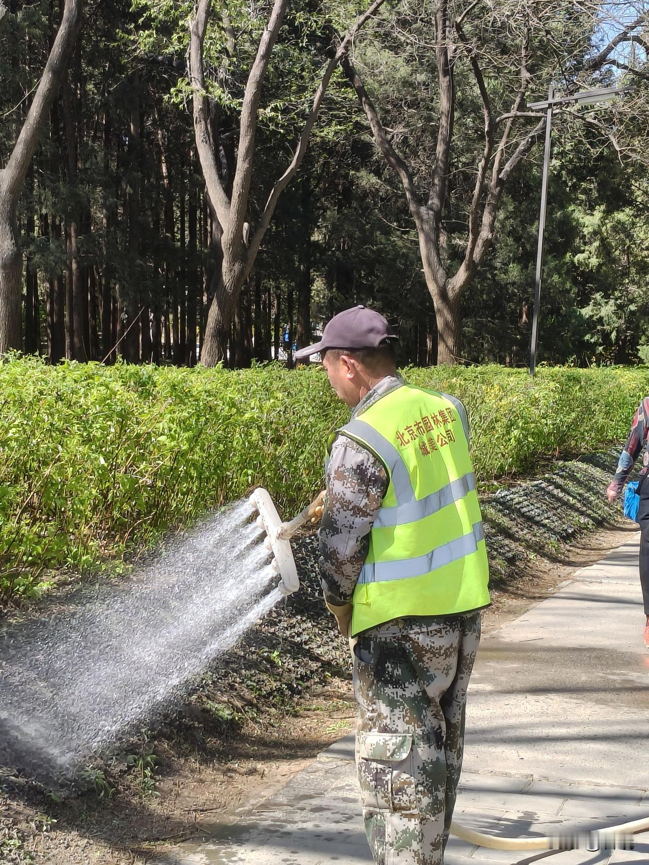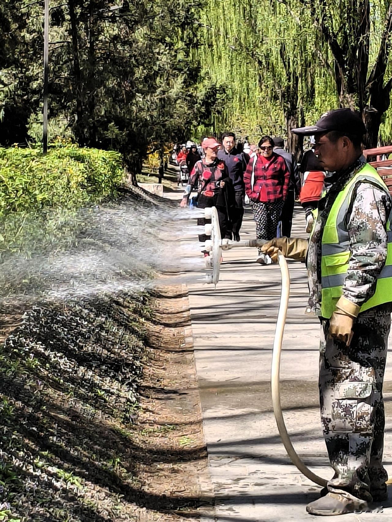 横着浇树根,竖着洗树叶,水流被均匀喷洒在植物上,一点都不浪费。