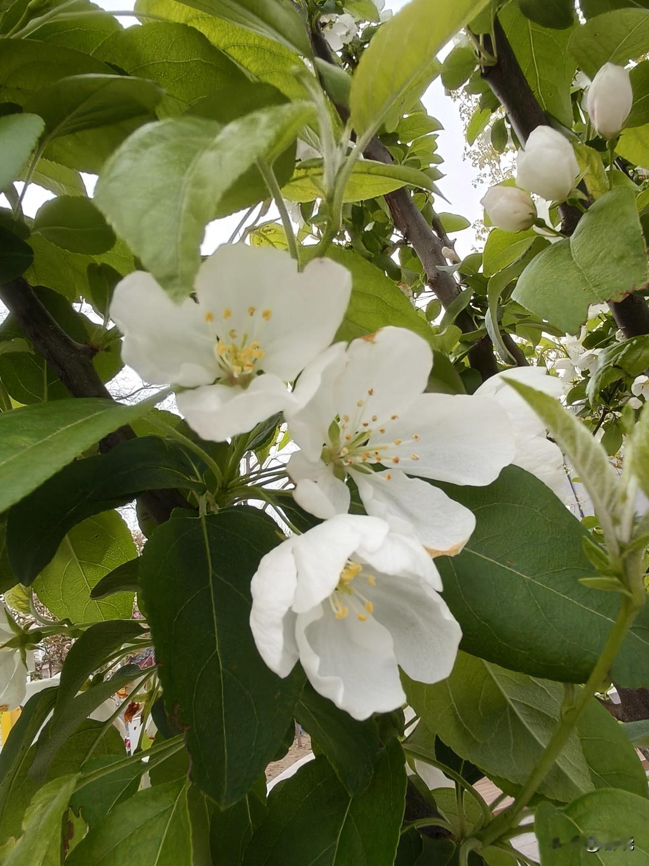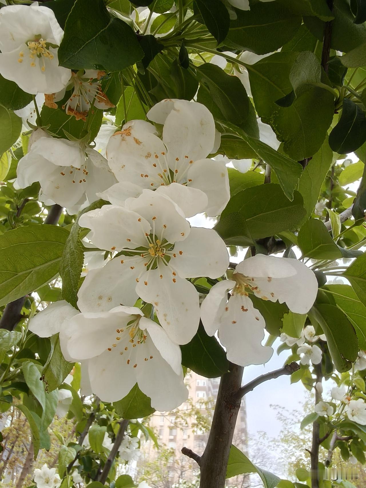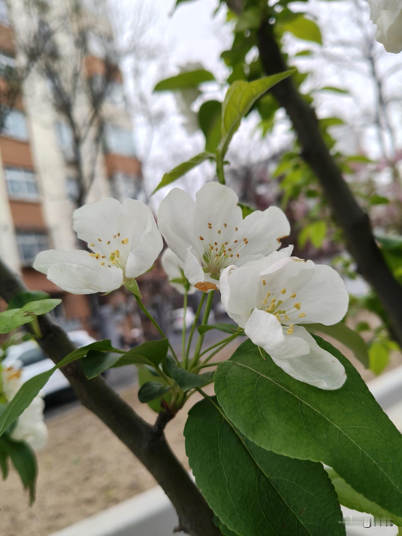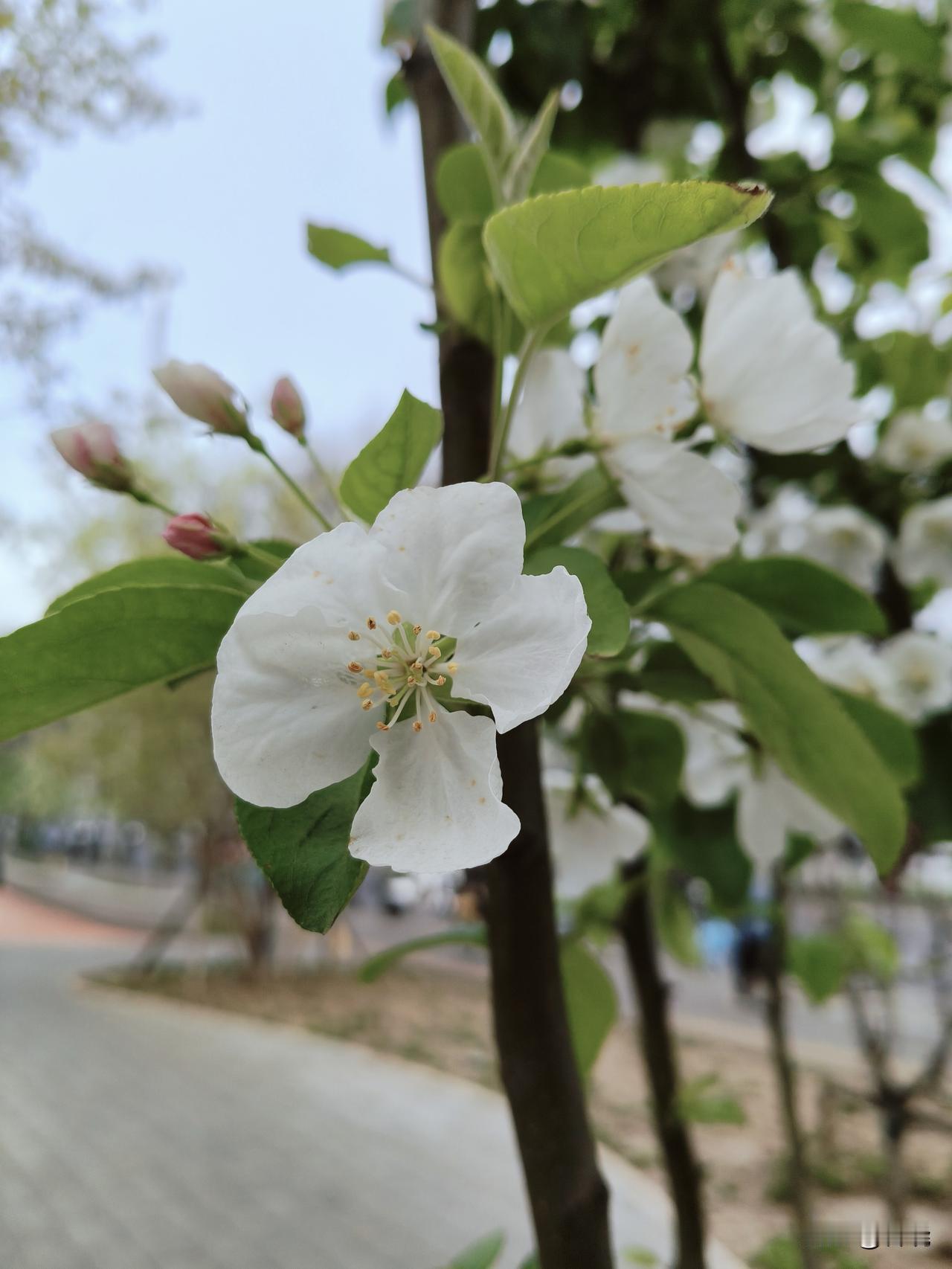 走在过街天桥上,看到不远街边处有一片白色的花,便走近去看,居然是天府海棠。
