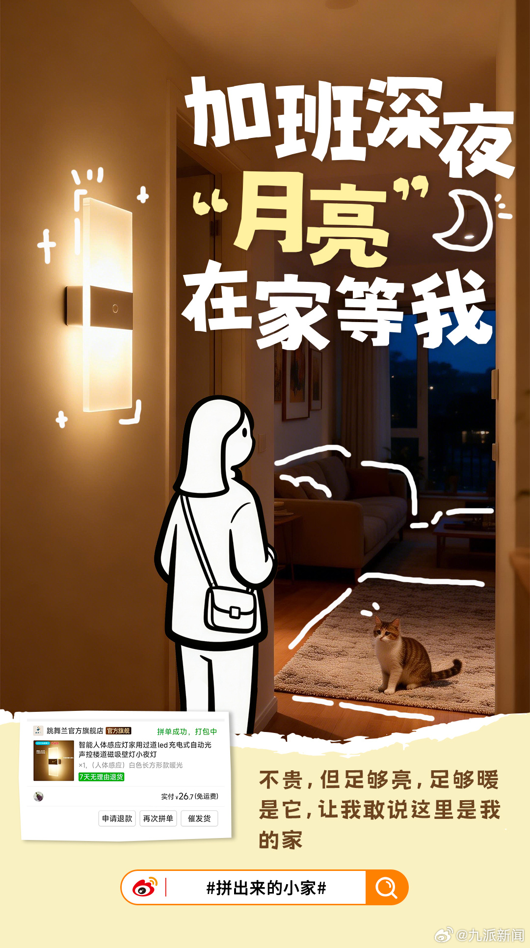 #拼出来的小家# 9幅手绘温暖瞬间,记录家的模样。从深夜归家看到的"月亮"灯光,到周末窝在沙发的惬意时光,从热水澡驱散疲惫,到冰箱里塞满的小确幸……每一个角落都是生活的证明。这些让家成为家的物件,都能在拼多多找到。你的家里,藏着哪个温暖瞬间?
