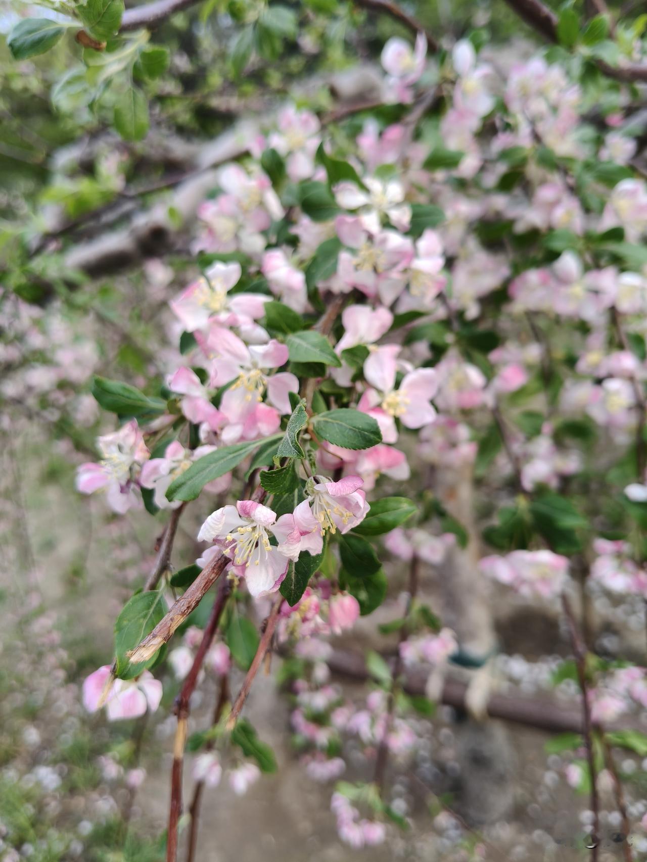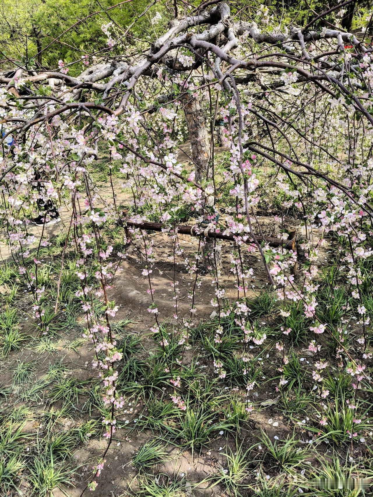 数不清的长长枝条上,缀满了深粉浅粉,粉白相间,娇嫩美丽的海棠花,垂如瀑布般倾泻而下。