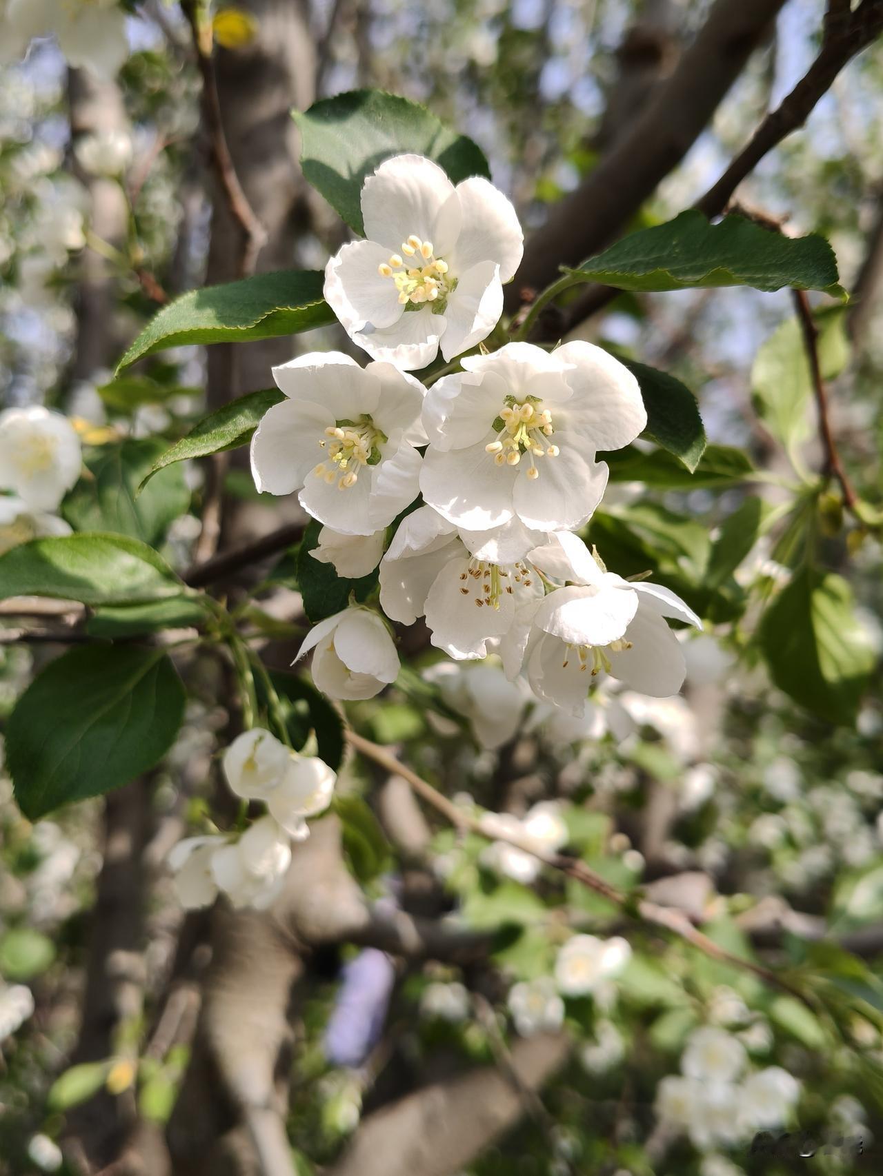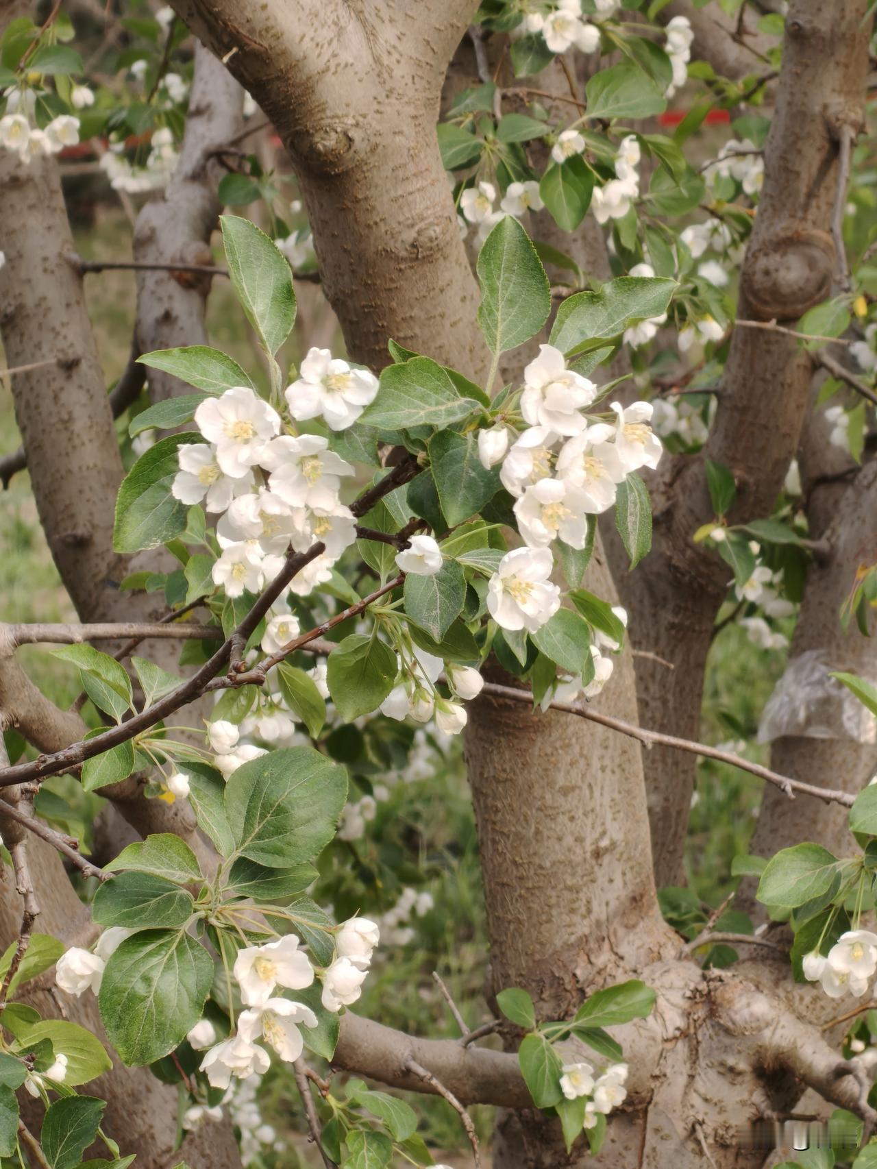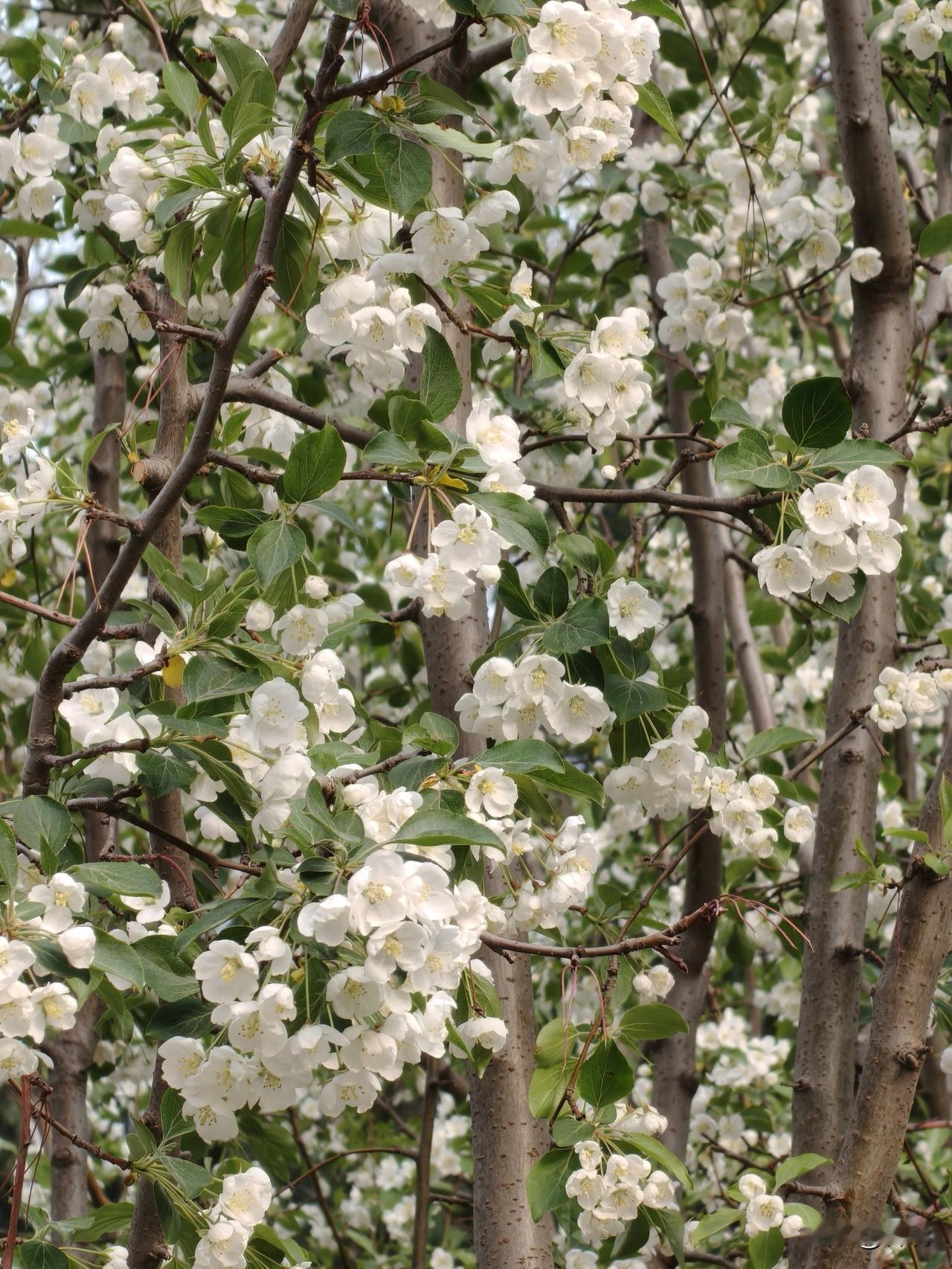雪坠海棠 今日在海棠花溪,我有幸目睹它的风采。 一树雪坠海棠,把人间四月,开成满