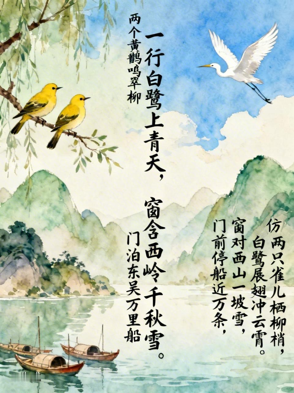 唐朝诗人杜甫见到黄鹂、白鹭和泊船写下了千古绝句: