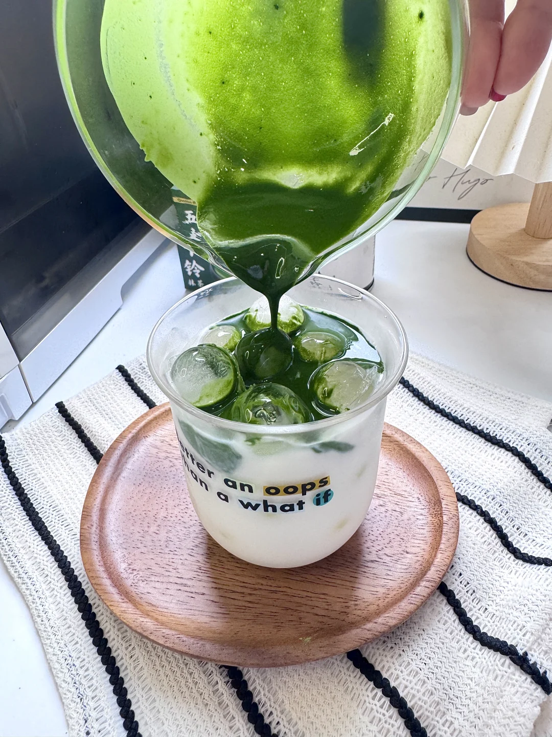 2.杯子里加入冰块和牛奶,淋上抹茶液