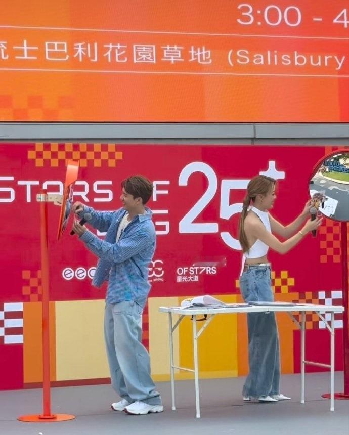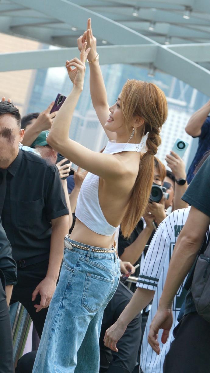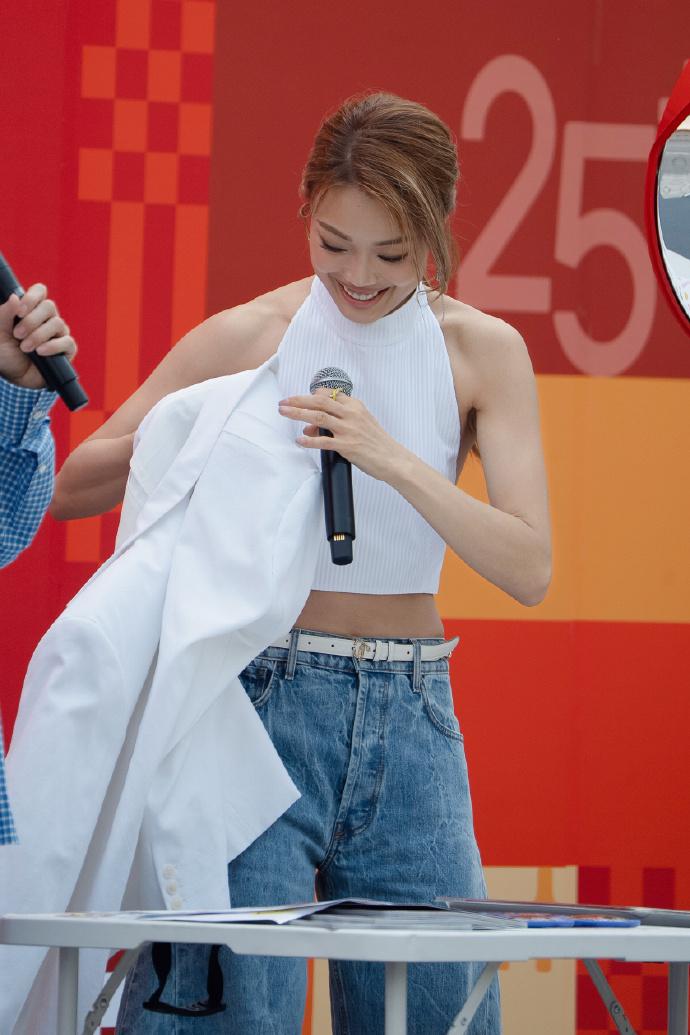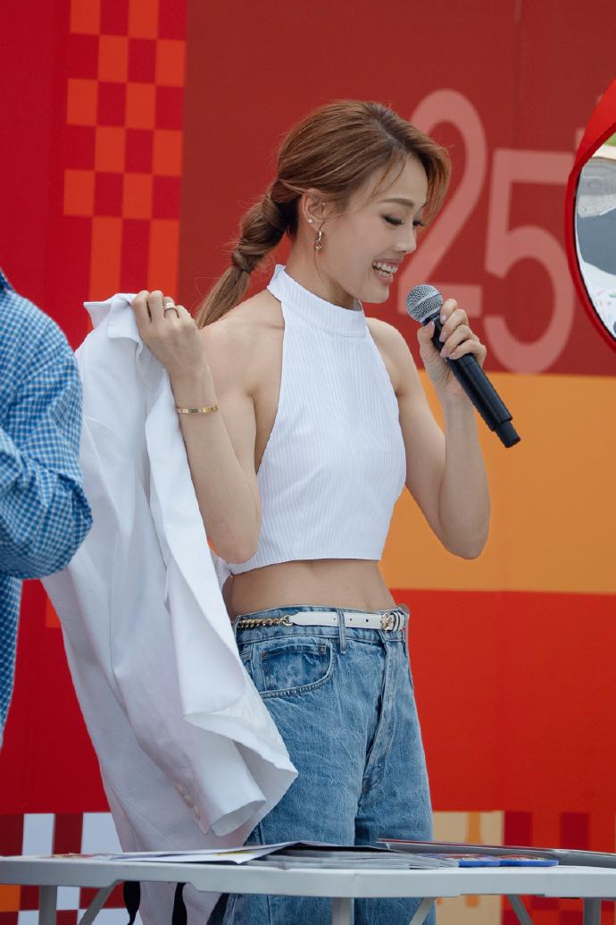 容祖儿上身穿白色挂脖短上衣,下身搭配水洗牛仔裤,这次她大秀细腰,还展现出了完美的身材比