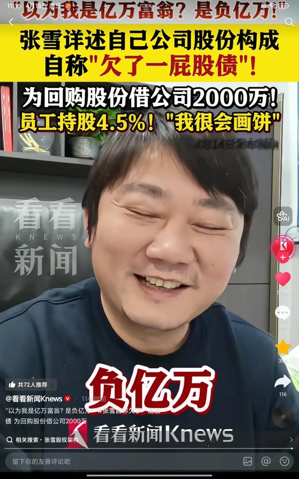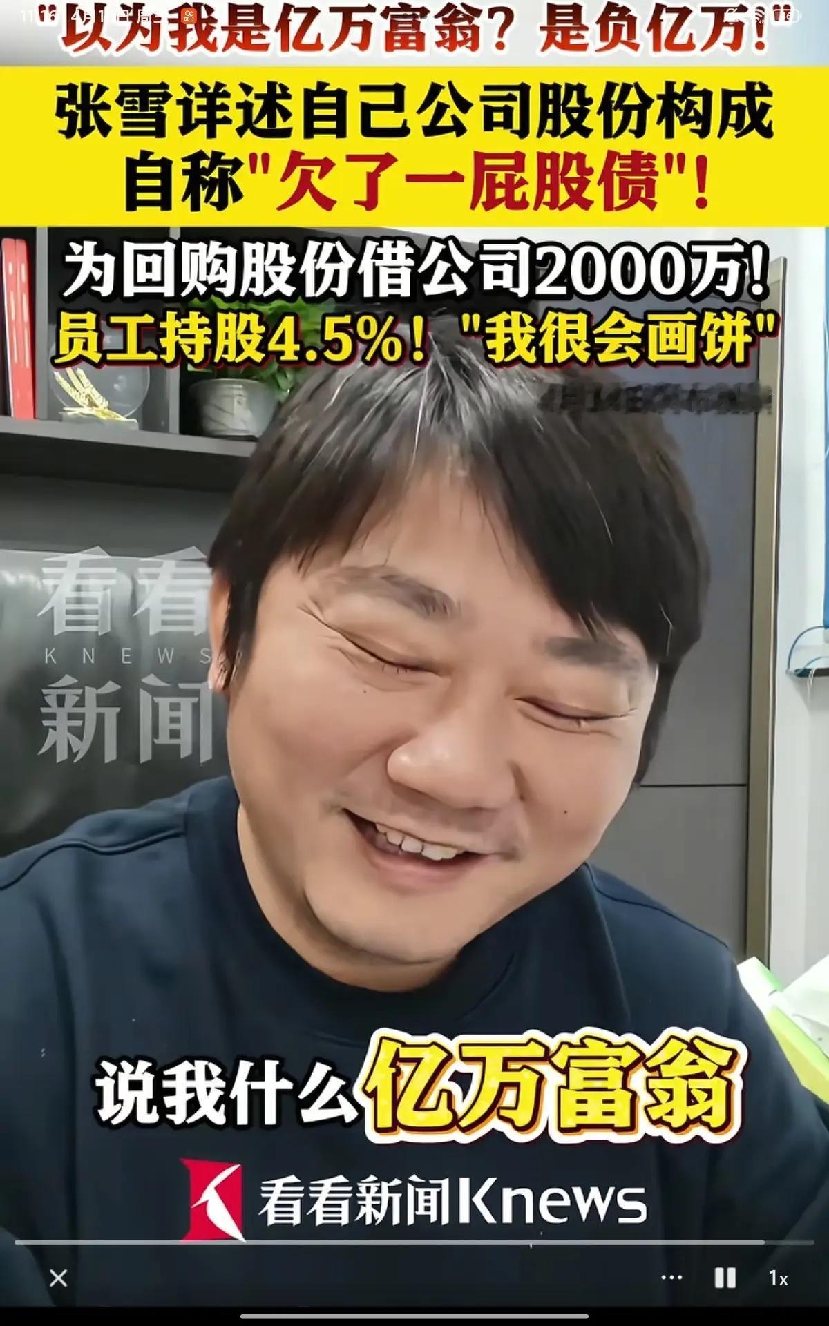 张雪欠公司的3000万,根源是早年的股份回购操作。公司刚起步做天使轮融资时,有天使投资人投入2000万,拿到了公司20%的股份,双方还约定了后续的股份回购条款。张雪想要把核心股份握在自己手里,也想给公司核心员工留出股权激励的空间,于是决定回购其中10%的股份。