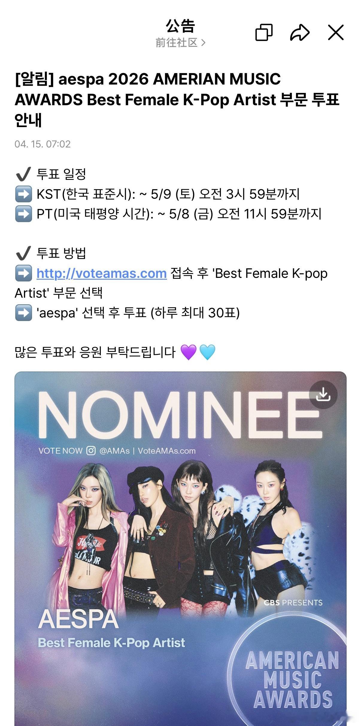 aespa提名AMA最佳kpop女艺人 aespa被2026年AMA全美音乐典礼提名为最佳kpop女艺人,恭喜🎉 aespa入围全美音乐奖