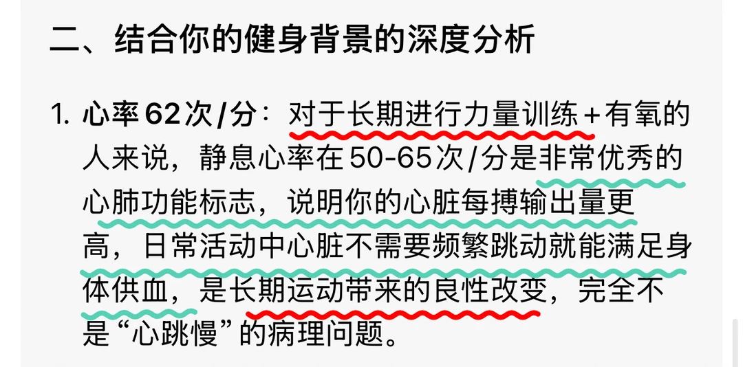 • 静息心率62次/分,是心脏被练得更有力、更高效的证明;
