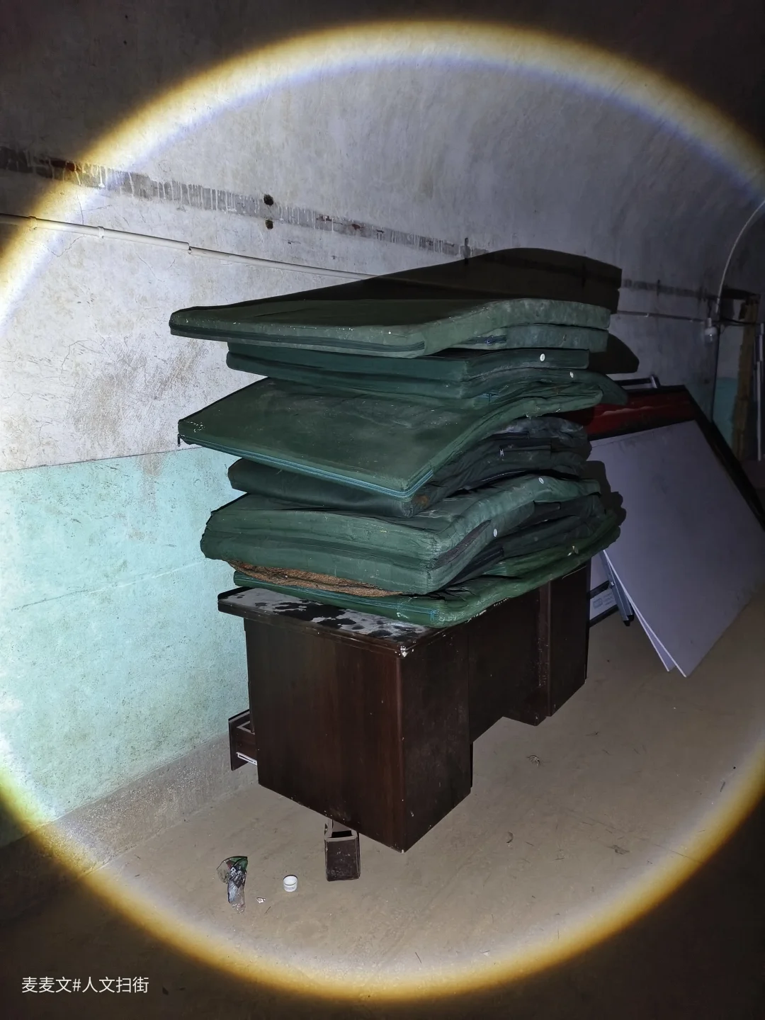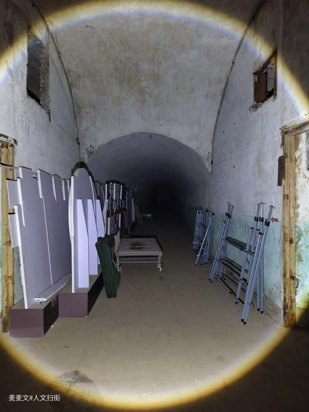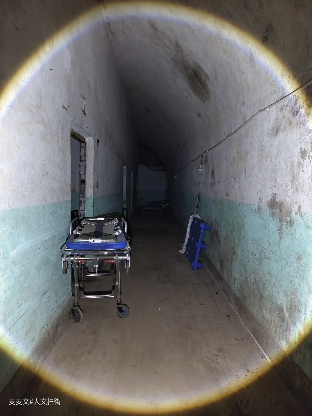 洞内,堆叠的绿色床垫、闲置的担架车静静伫立,弧形的洞顶延伸向黑暗深处,每一处细节都藏着战时应急的印记。这里曾是隐蔽的生命防线,承载着守护与坚守的使命。行走其间,手电光束扫过满是岁月痕迹的角落,仿佛能听见当年的脚步声与呼救声,满是震撼与感慨。