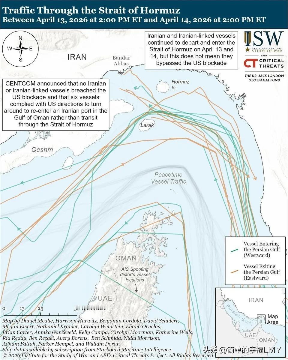 这种“领海绕行+公海转运”的模式,已经成为伊朗突破封锁的核心手段。截止当地时间4月14日,至少有8艘船只驶离霍尔木兹海峡,其中6艘是伊朗或与伊朗相关的船只。