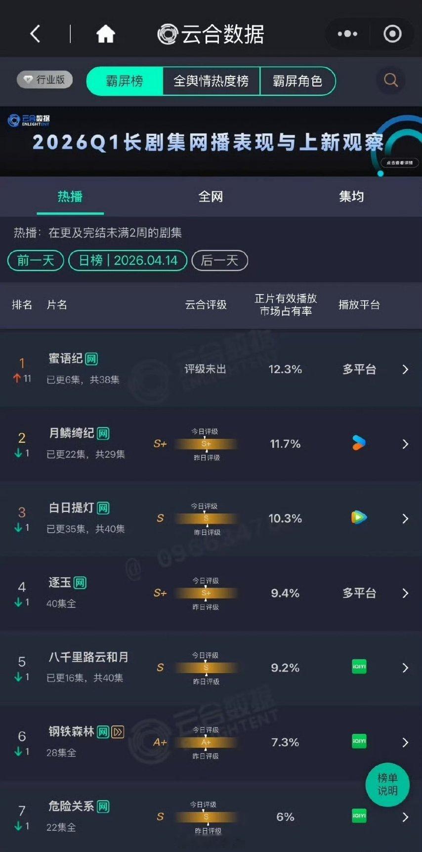 蜜语纪直接上升11名!登顶了,好猛啊翻了4倍…4.14云合 市占率,中年现偶还是有市场的,打小三儿永不过时冰湖重生这剧完全看不出有流量的水平,播成了A级