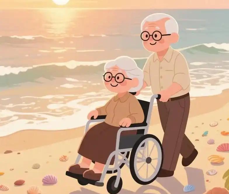 花树下,一位老者推着轮椅缓缓停下,轮椅上坐着他的老伴。