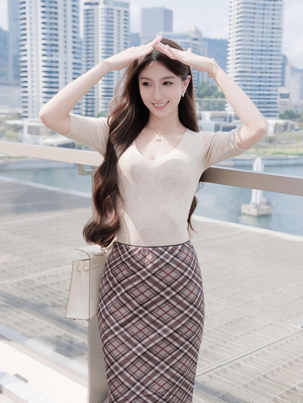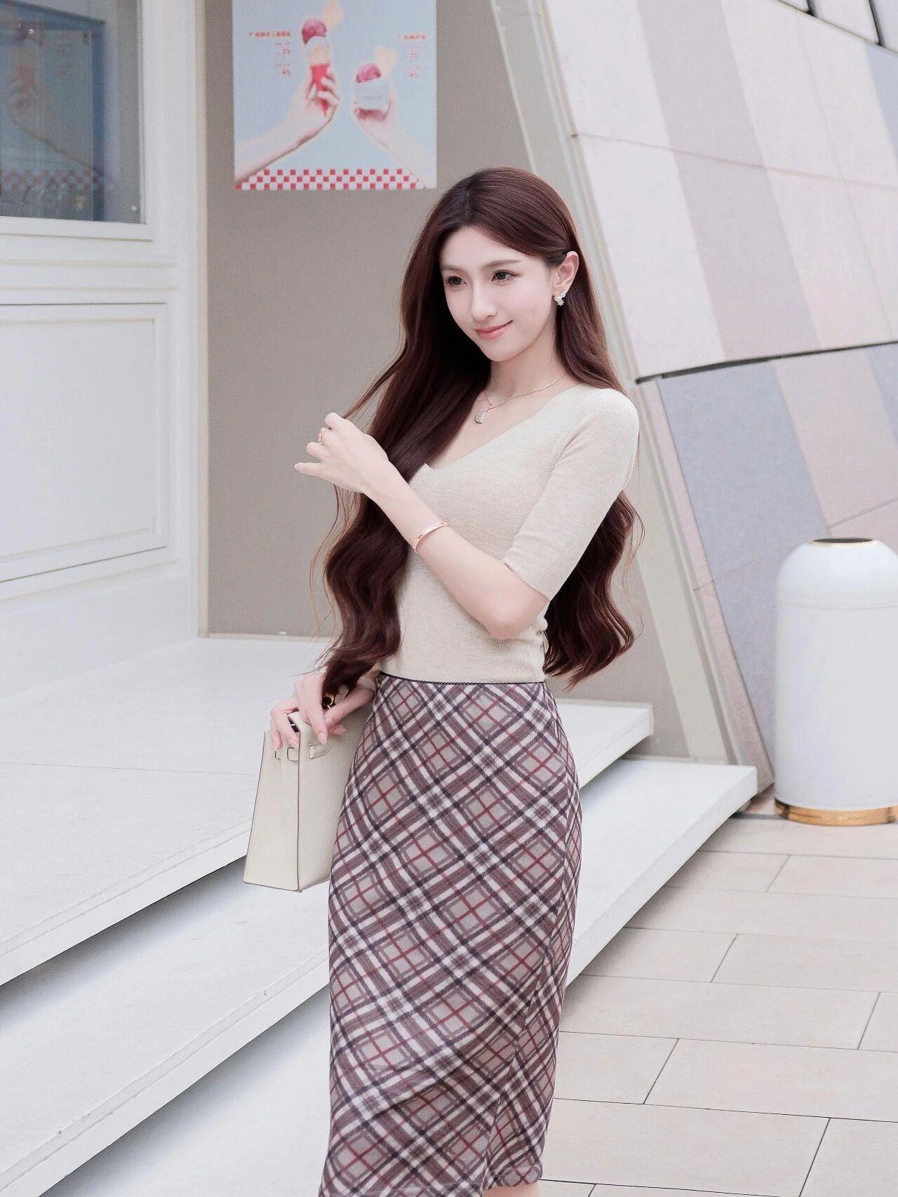 下装:棕调复古格纹包臀半身裙,垂坠丝滑面料勾勒身形,复古格纹温柔耐看,和上衣色系完美适配
