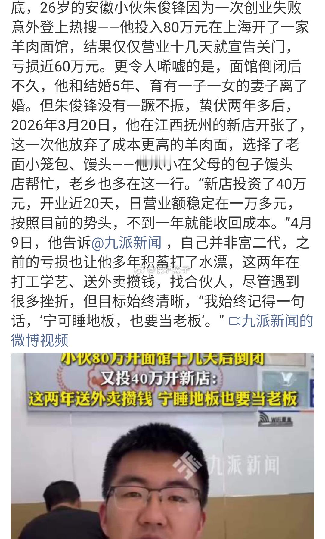 80万开店倒闭又投40万开店小伙发声“新闻学“魅力越来越足。简述一下就是:已结婚5年育有俩孩的26岁安徽男子在上海投80万开店失败,离婚后送外卖打零工两年又投40万在江西开新店。瞧瞧,眼下热词都叠满了:多孩,离婚,灵活就业,投资,网红。嘴上说着不搞直播认真做包子,还不是弄来个“发声”。袋子时评