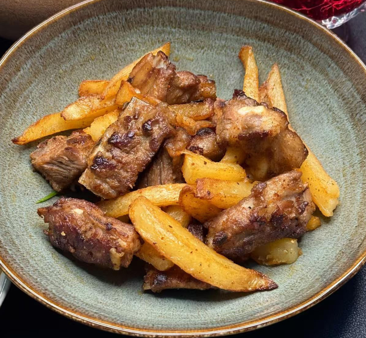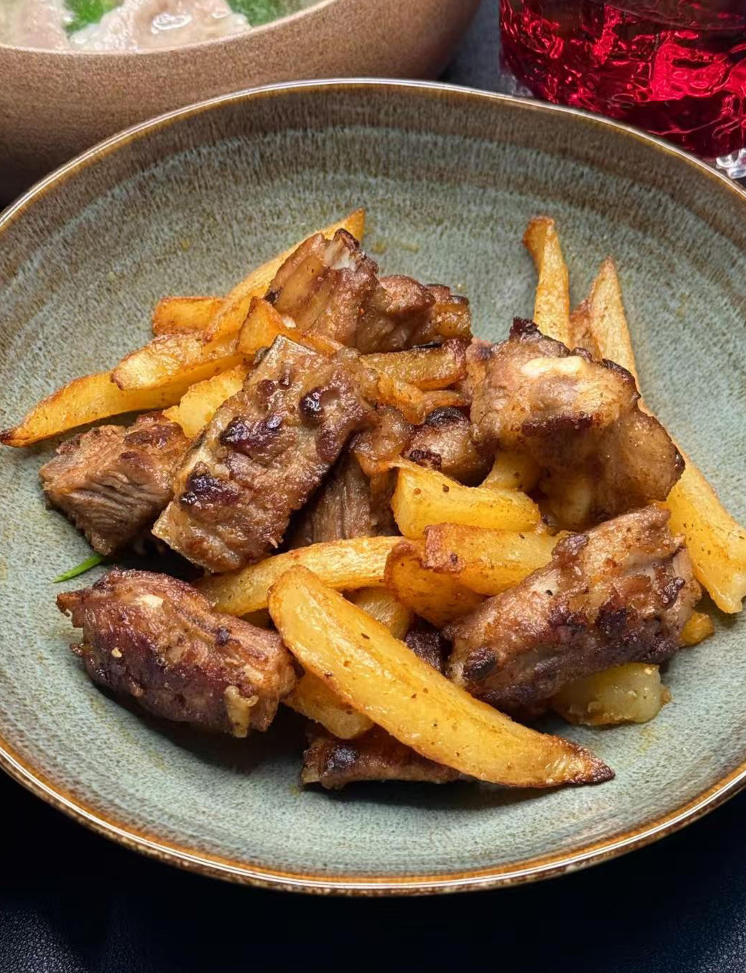 油热下土豆炸焦黄熟透,捞出备用;留底油煎排骨至成熟