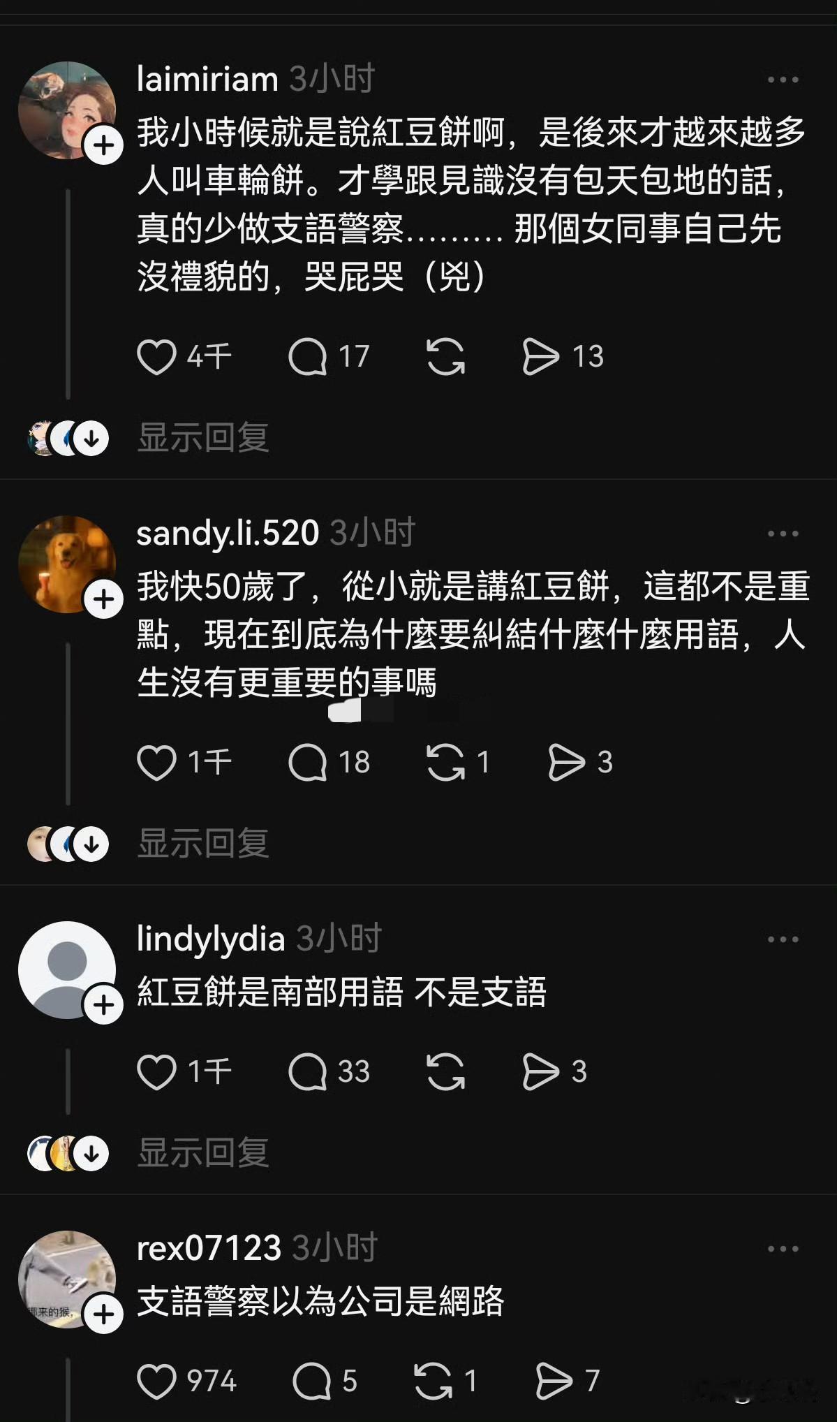 台湾的一个网友发布动态,她要去买红豆饼,问其他同事要吃什么味的。结果被其他十几个同事“围剿”,因为红豆饼被认为是大陆叫法!