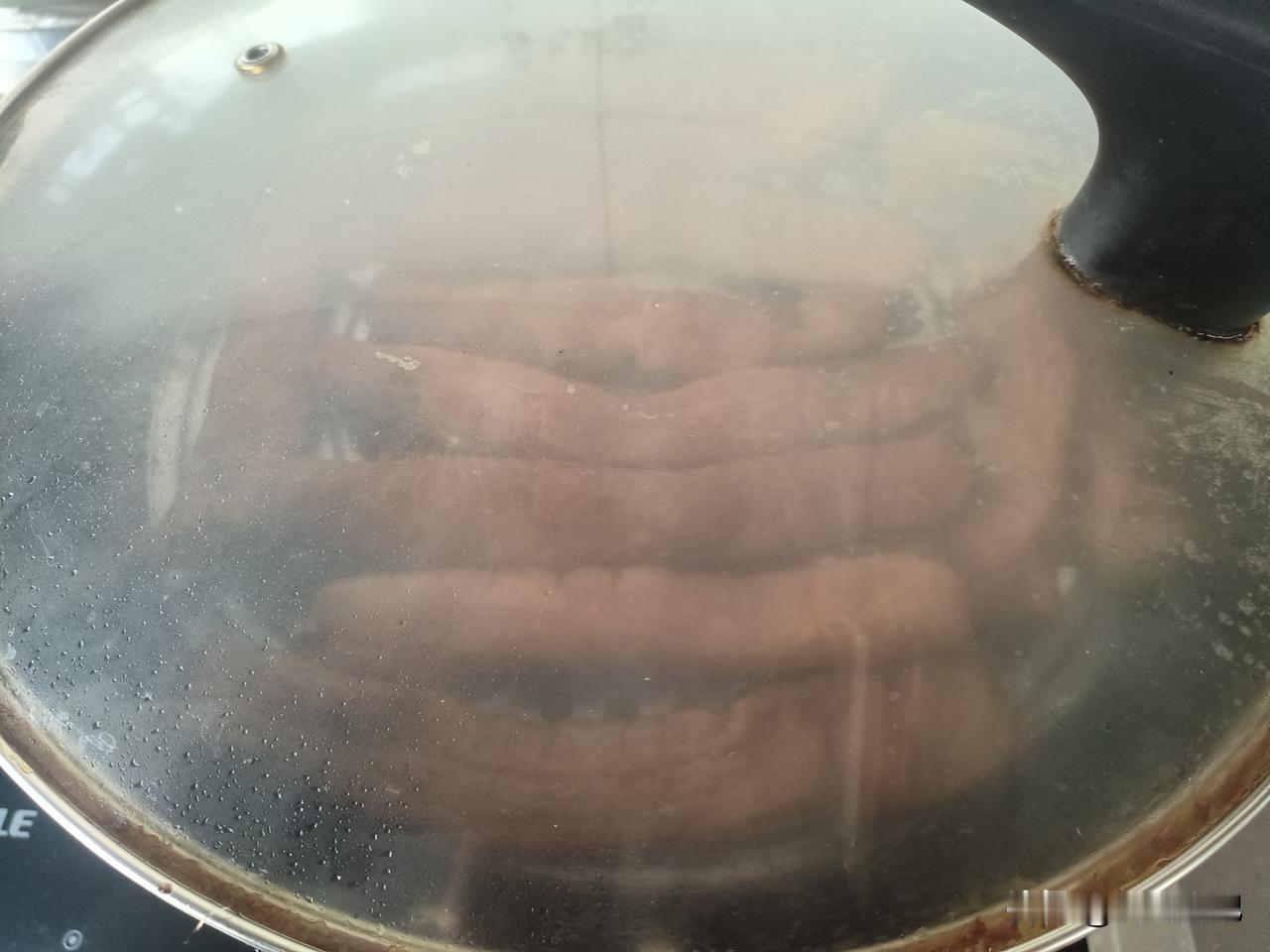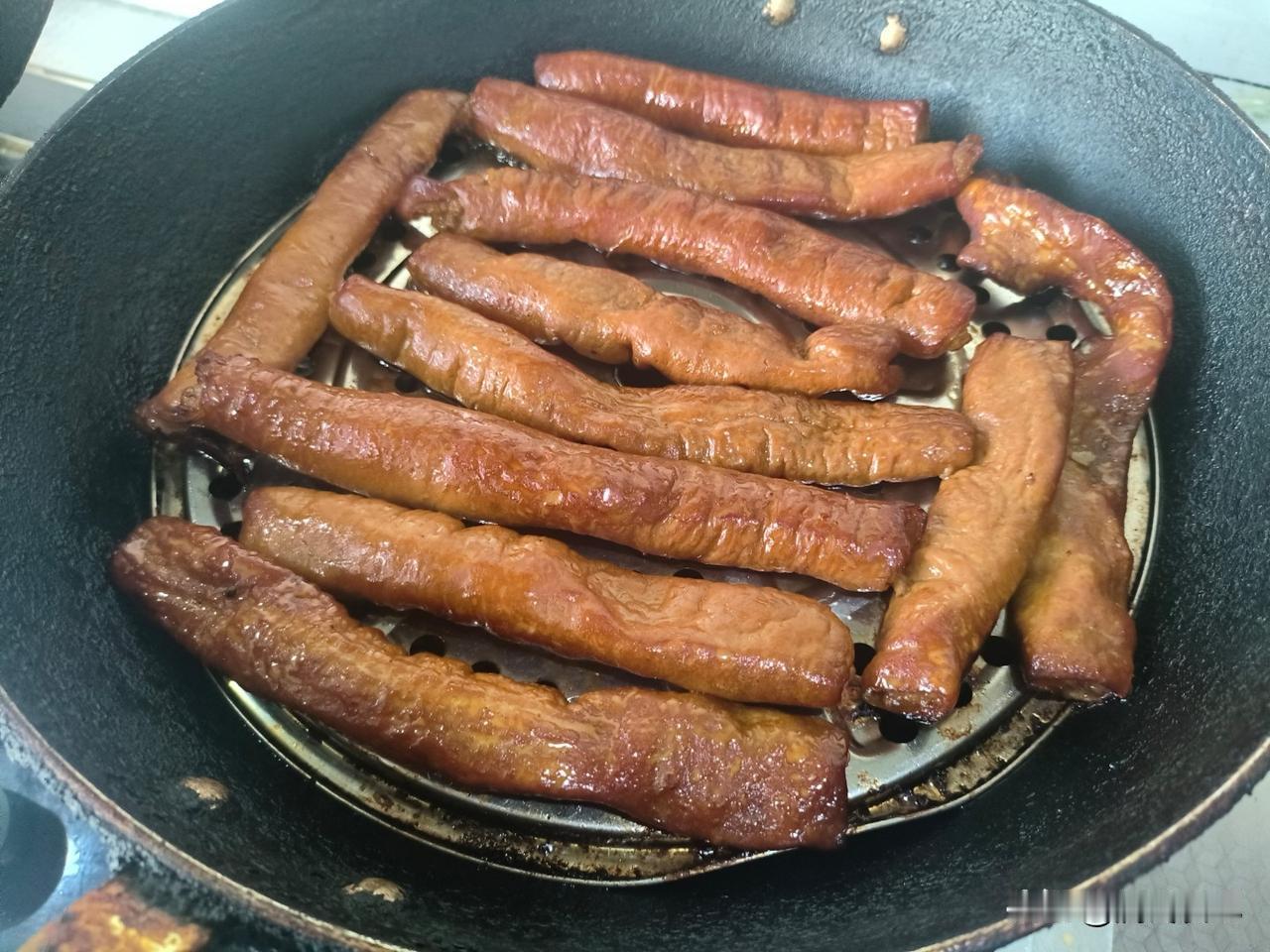 老卤汤现成的,把大肠先卤出来。然后找最破的铁锅下面垫个锡纸,放上点茶叶,小米,大米,白糖,把大肠摆在铁篦子上。锅盖盖紧,开火3分钟左右,出现黄烟就可以关火。等到黄烟再消散,就算熏好了。