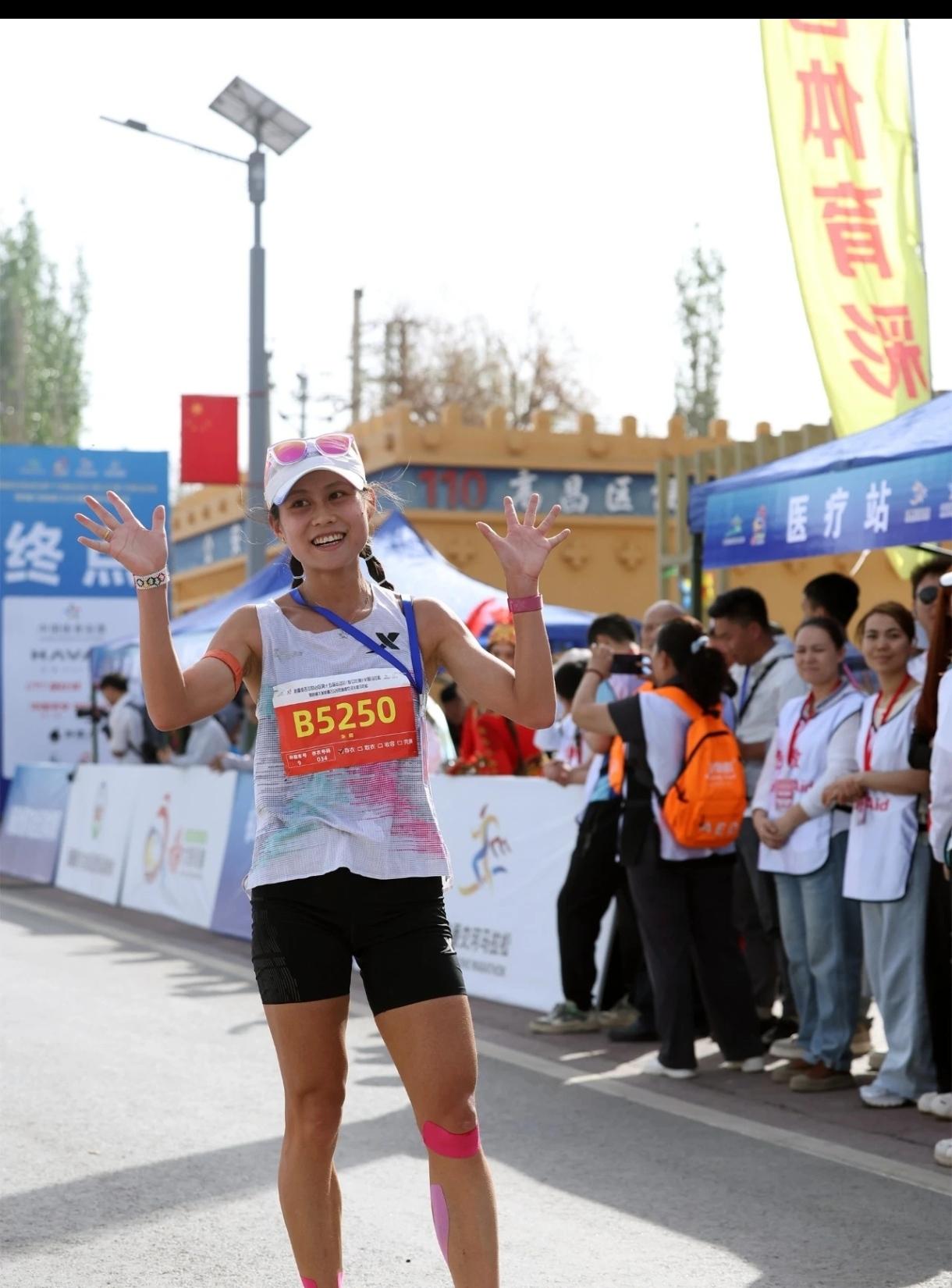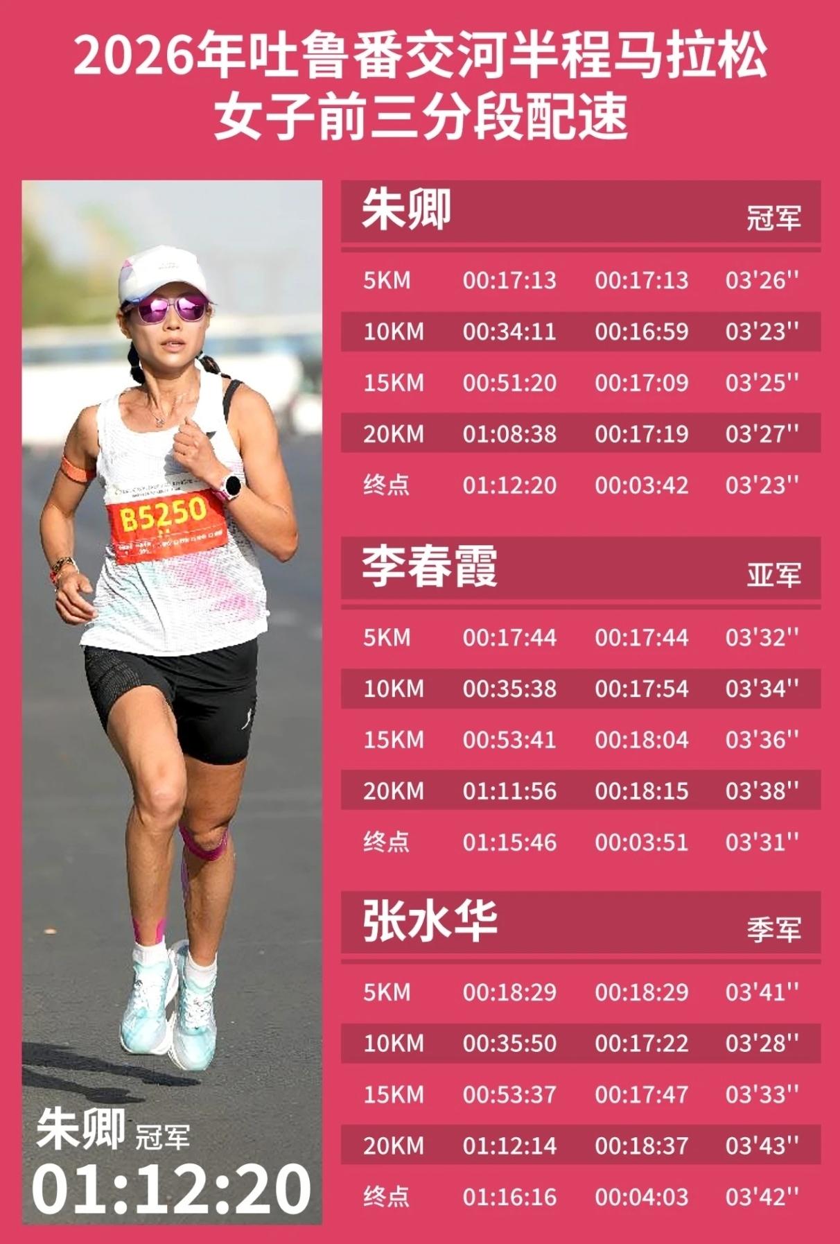 在火焰山旁开启混氧训练赛,全副武装奔跑仍被跑友认出加油,凭借稳定发挥,以1小时12分20秒斩获女子半马冠军,大幅提升赛会纪录6分多钟。