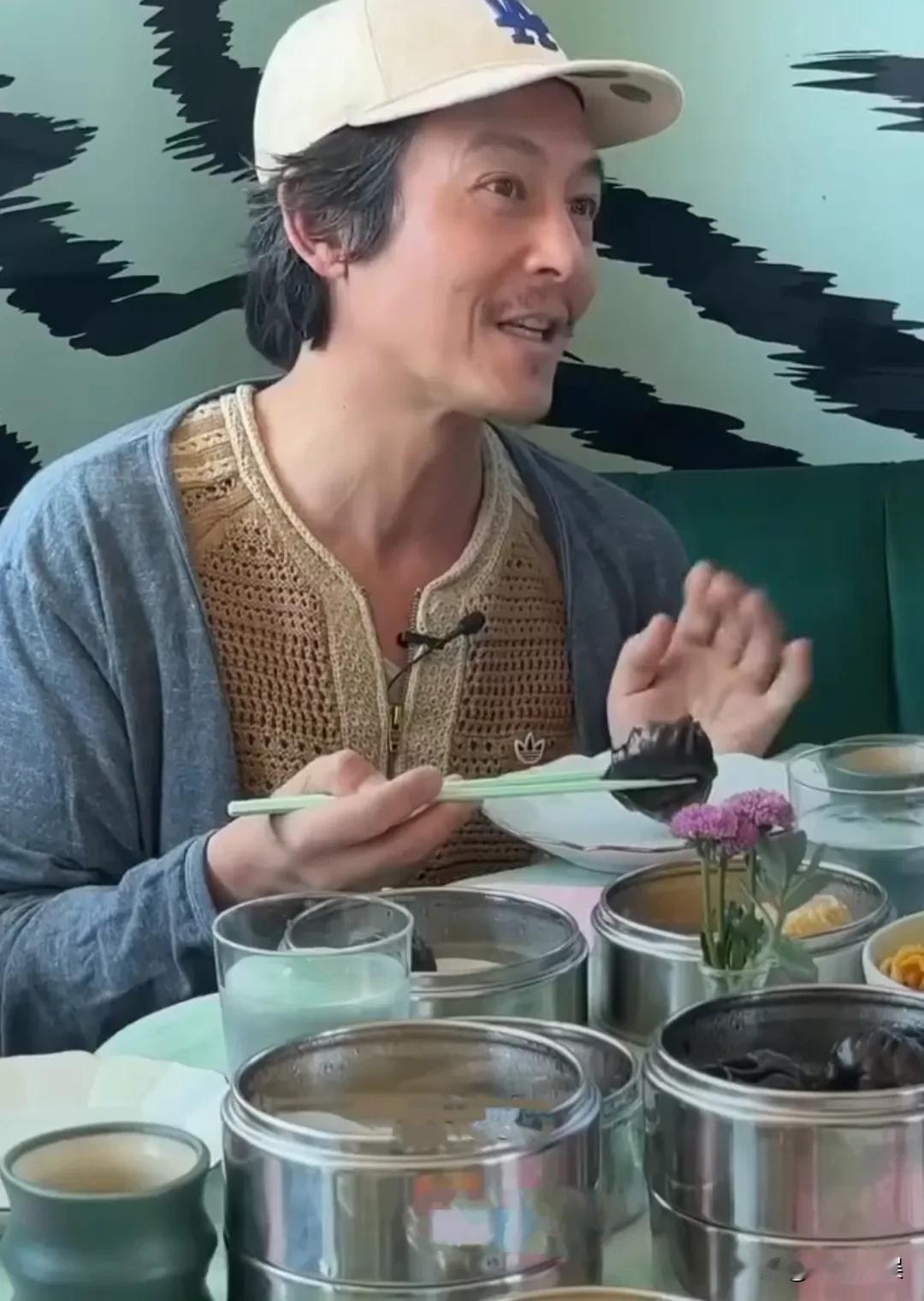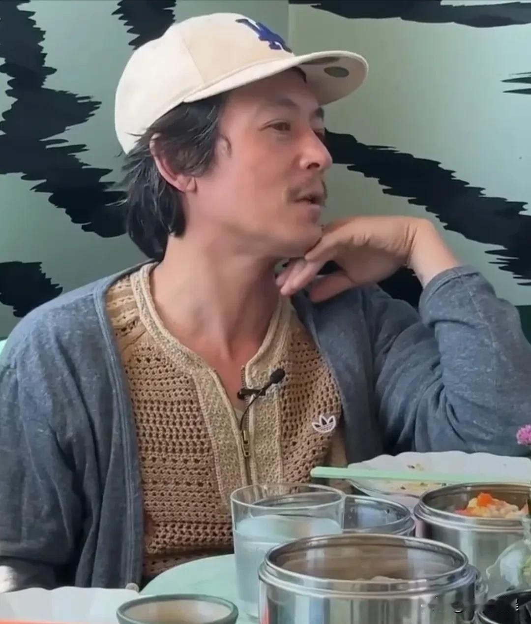 但是这几年他老的也挺快的,断崖式衰老。穿着灰蓝色针织衫的他,戴着棒球帽,留着八字胡,头发白发挺多的,笑起来满脸褶皱子,颈纹也很重,其实他才四十几岁,看起来却比实际年龄老的多。