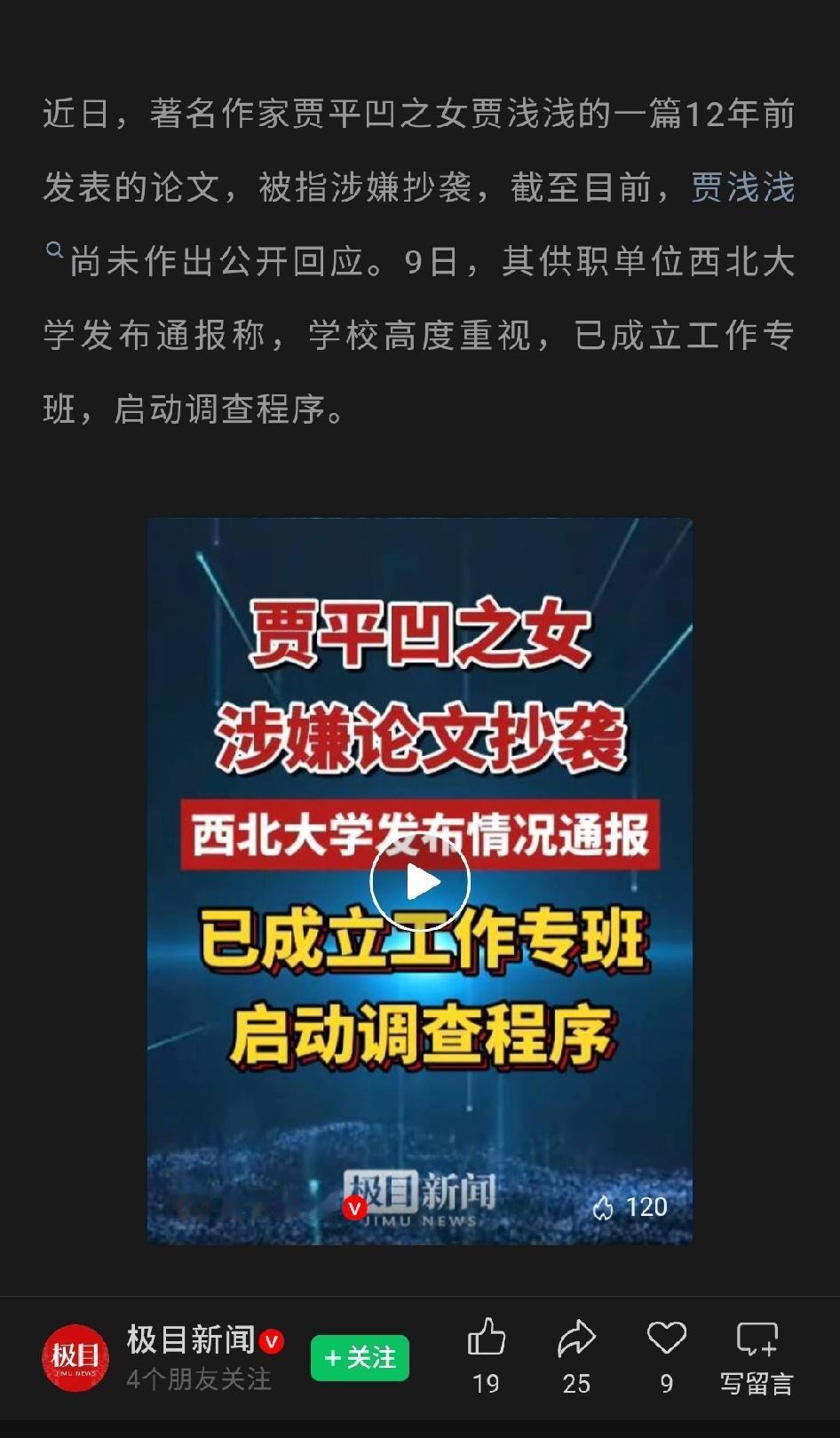 校方调查贾浅浅的父亲是著名作家贾平凹。而贾浅浅目前供职于西北大学。 这次提到涉