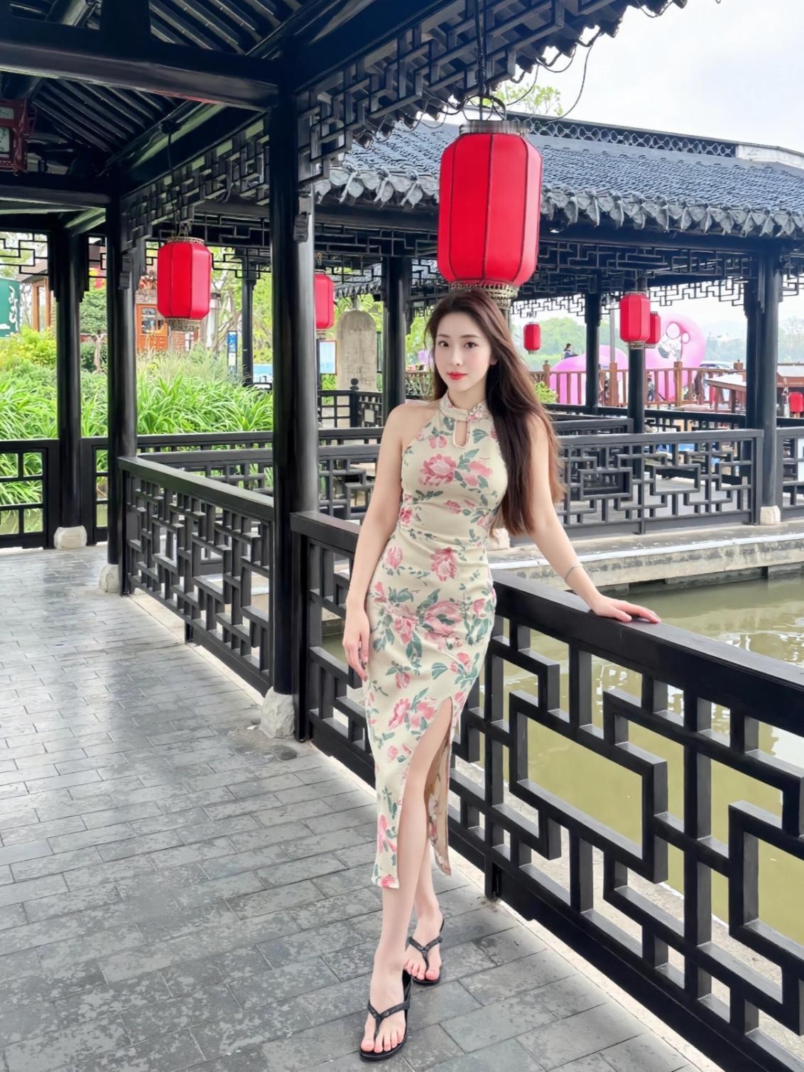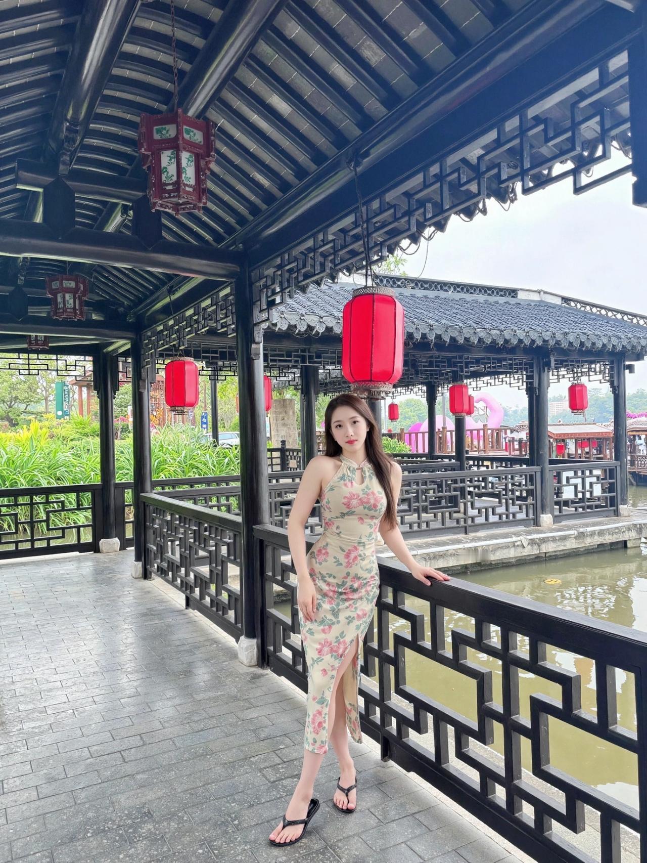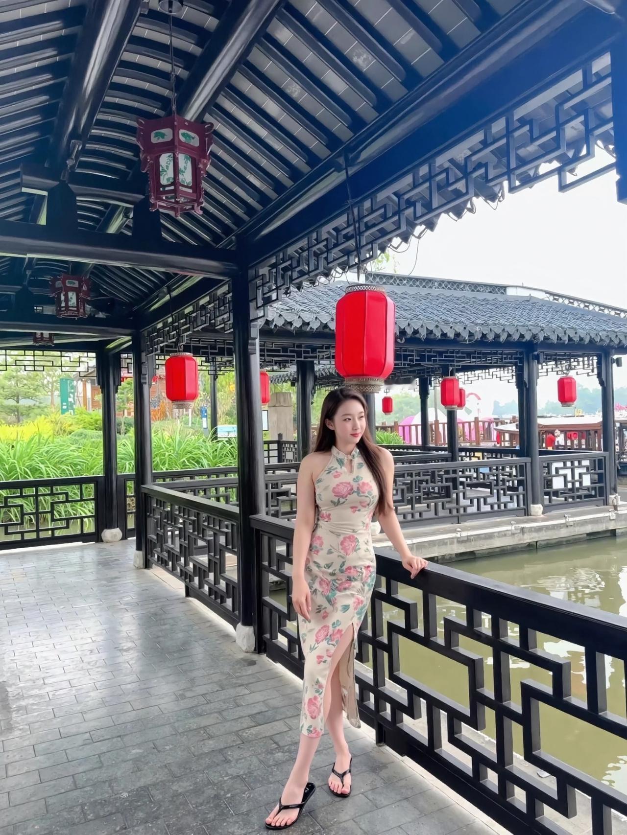旗袍少女漫步古风长廊,红灯笼点缀,尽显东方韵味。