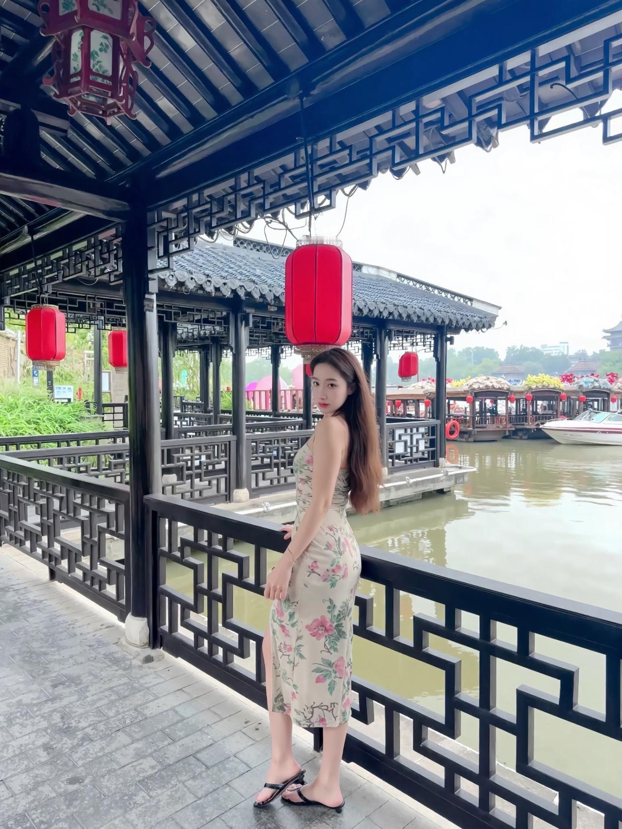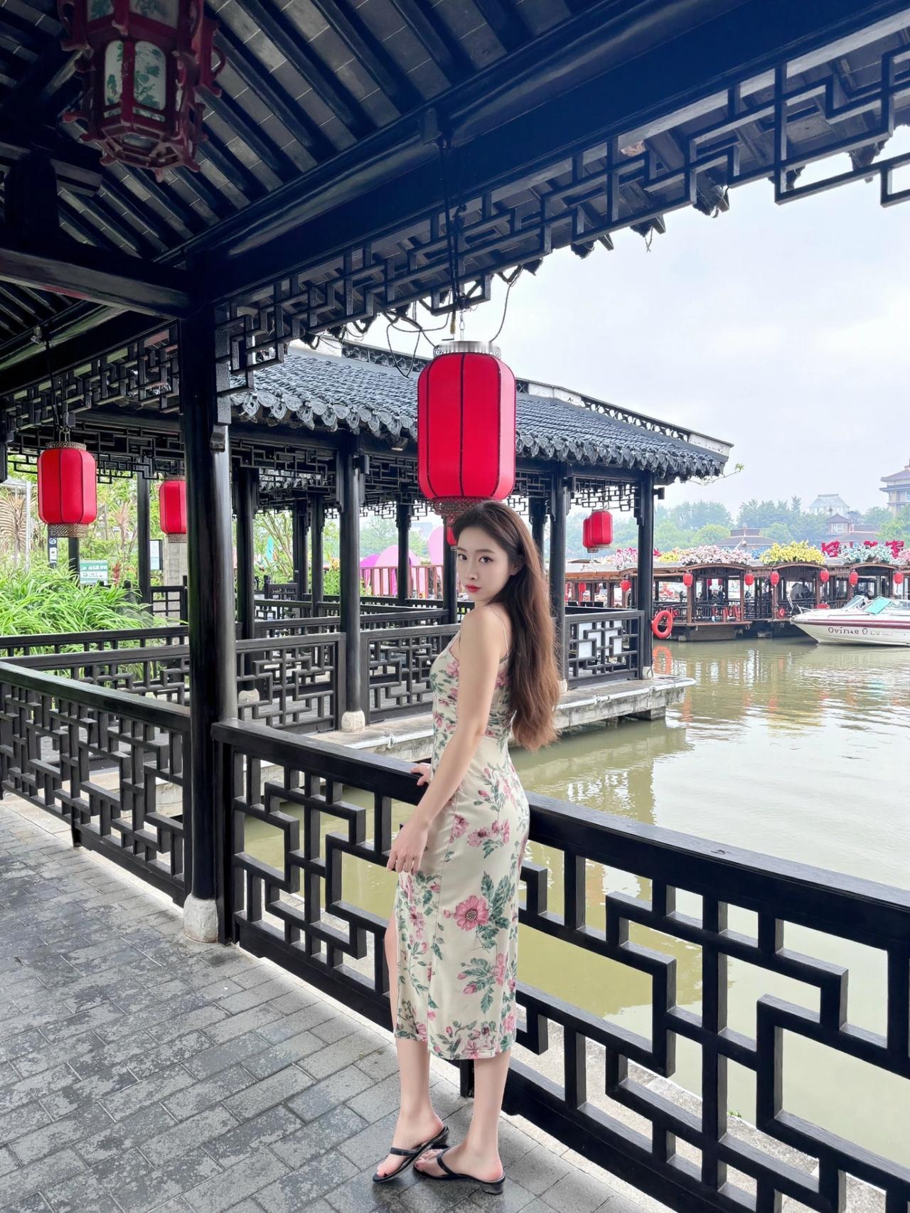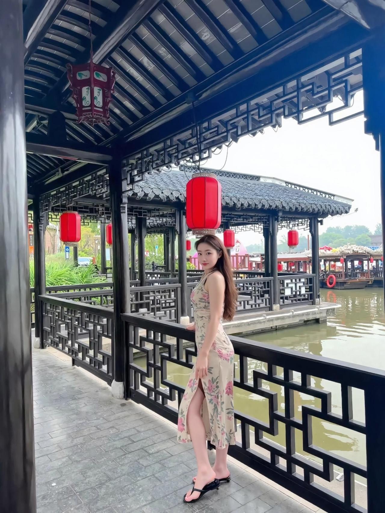 旗袍少女漫步古风长廊,红灯笼点缀,尽显东方韵味。