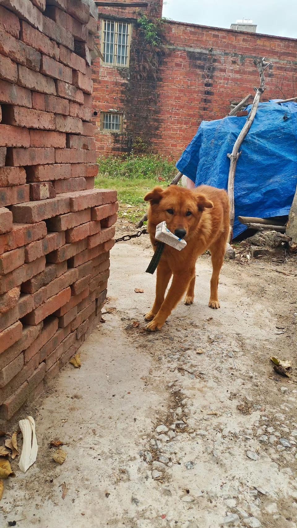 朋友笑着解释:它怕你怕它。嘴里叼着东西,就咬不了你了。这是它的“安全声明”。