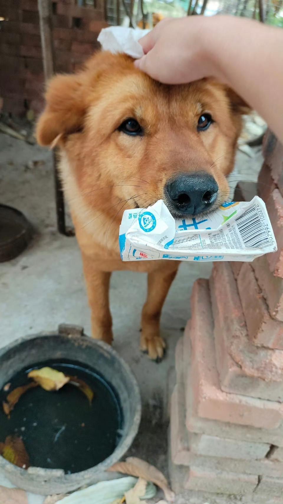 小狗不会说话,但它用行动告诉你:我很大,但我很温柔。如果你怕我,我就叼个东西,证明我没法咬你。这样,你就可以放心摸我了。