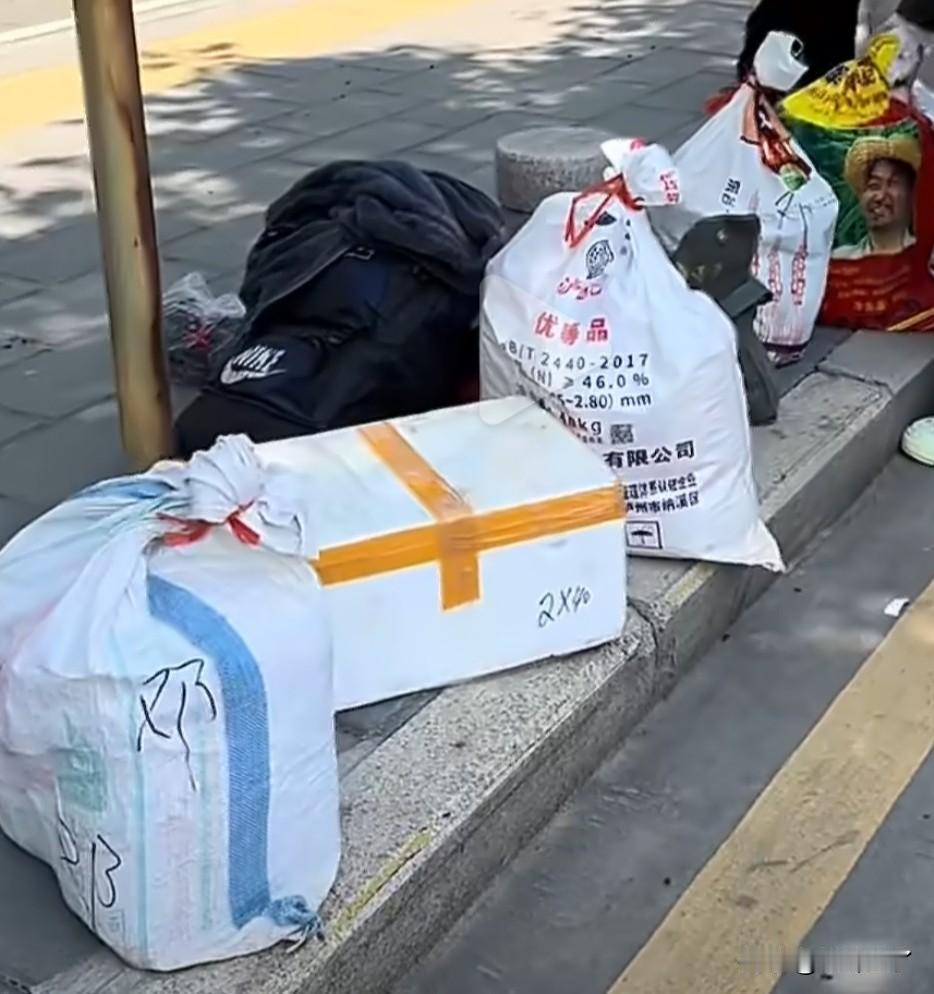 这位父亲下了长途大巴,女儿,女婿开车来接她时,他正坐路边吃东西,他吃的是自家带的冷馒头和白开水。身边摆了一溜从大巴车上卸下来的货,有泡沫箱装的,有塑料袋装的。那是他带给女儿的。