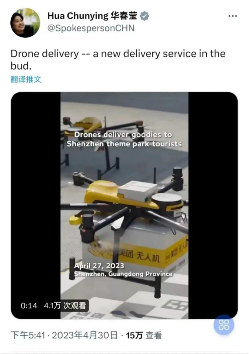 而最近,中国无人机又把老外看傻了,美团在八达岭长城开通了无人机配送服务。要知道很多外国元首来华访问、外国人来华旅游,八达岭长城是他们绕不开的一站,当他们看到无人机在长城上空配送,这不仅是我国硬科技服务于民的展现,也让国外友人看到了中国现代化的发展成果。今年华姐华春莹在社交媒体上点赞美团无人机的推文更得到了很多老外的夸奖。