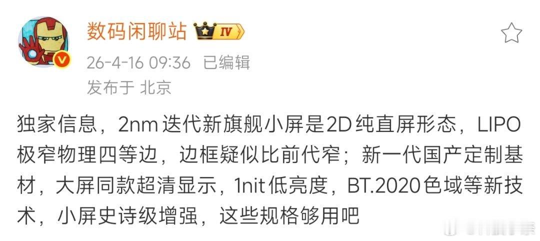 同时据站哥爆料:“2nm 迭代新旗舰小屏是 2D 纯直屏形态,LIPO 极窄物理四等边,边框疑似比前代窄;新一代国产定制基材,大屏同款超清显示,1nit 低亮度,Pol-less 去偏光片,BT.2020 色域等新技术,小屏史诗级增强。”很显然这暗示的是小米18 Pro机型的可能性也非常大。小米18Pro屏幕参数曝光